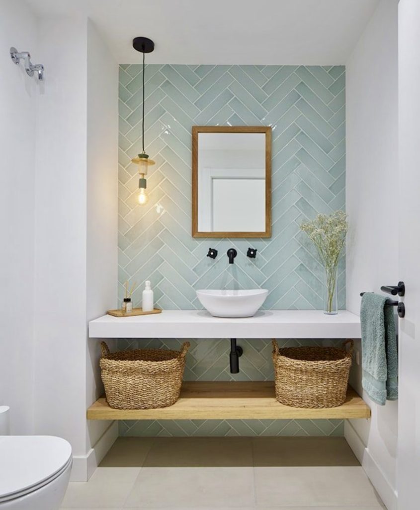 The blue herringbone-patterned floor instantly makes this minimalist bathroom appear lively and fresh with perfection. The open shelving option installed at the base of the vanity provides enough space to store commodities while giving the room a relaxed touch with perfection. The woven baskets installed in the room serve to make it natural with perfection, adding character to the room. The pendant light installed in the room provides it with plenty of space to appear lively and fresh with perfection. This can serve as great inspo for someone creating an airy coastal bathroom with perfection.