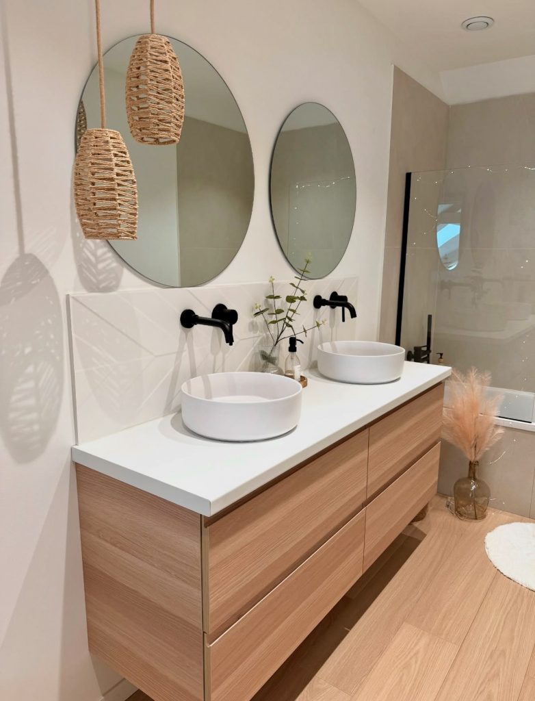 This bathroom makes great inspo with perfection in a double vanity room where it features the best of natural wood features complemented with perfection in the combination of neutral colors with perfection in them with round mirrors complemented with woven pendant light features with perfection in it that creates it to be great inspo with perfection for someone who wishes to implement nature in perfection in his/her own bathroom with perfection in it that maintains it in perfection with perfectly designed black features in them with perfection to completely contrast with perfection in it with perfectly designed modern features with perfection in them with perfectly designed nature in The pampas grass decor further adds to the rustic feel and generates a soothing ambiance. This space is an ideal inspo if you’re interested in simple yet apartment-convenient bathroom decor with an added elegant touch.
