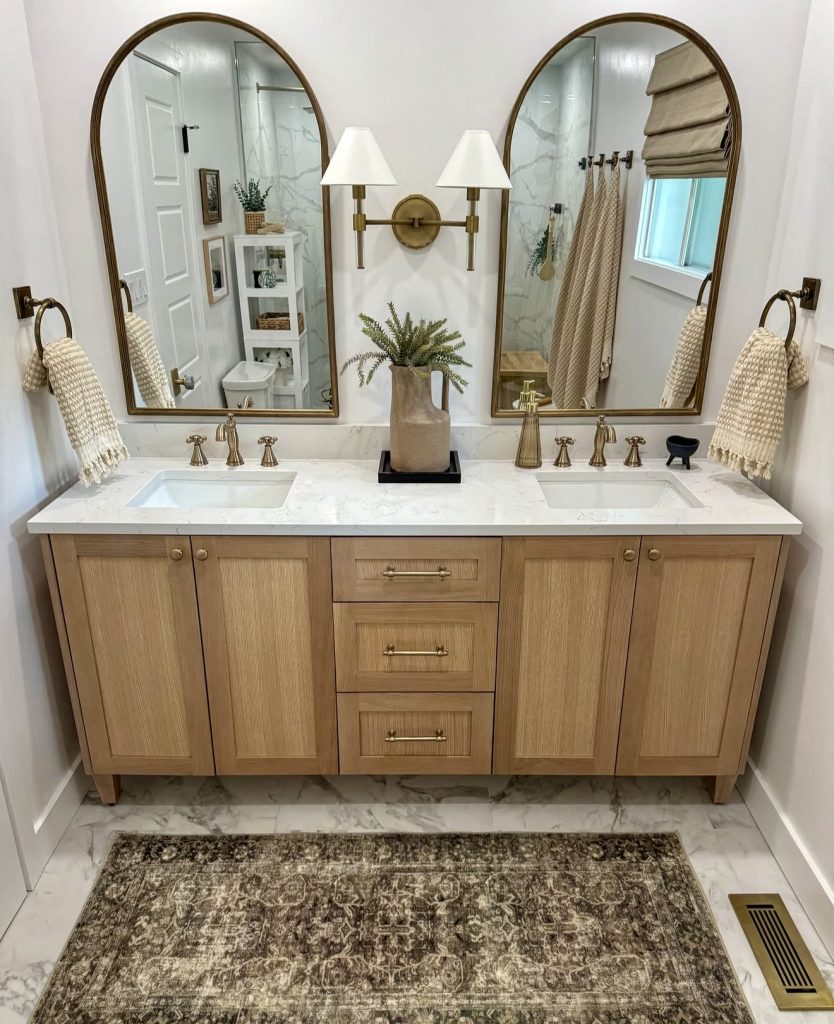This design combines timeless elegance with functionality through a double vanity framed by arched mirrors. Warm wood cabinetry paired with gold hardware gives the room a refined, luxury feel. Neutral styling with a patterned rug keeps the space grounded and inviting. Soft lighting creates balance, making this a versatile look for both homes and apartments. It’s a perfect inspiration for families who want both practicality and style in their bathroom.