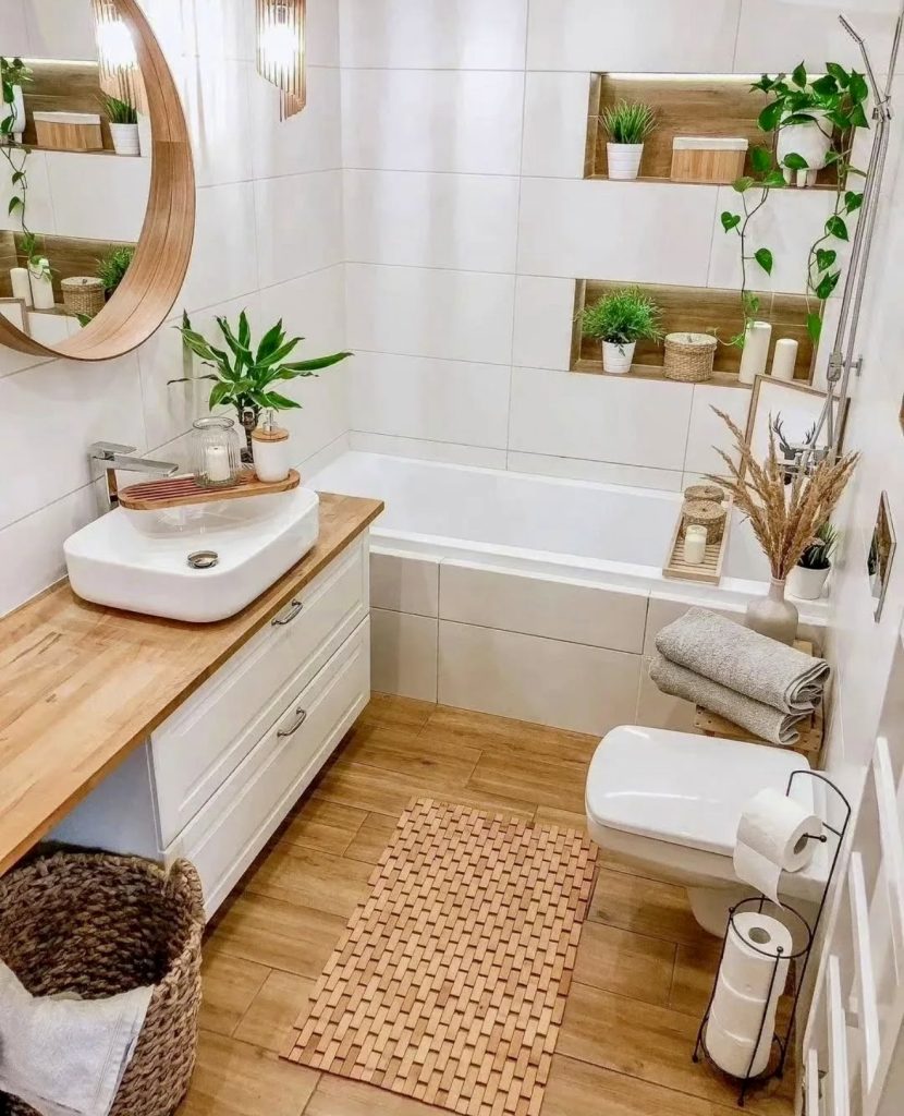 This bathroom makes the best of the rustic theme in a wood finish contrasted with light white walls and flooring. Adding plants to the wooden shelves creates lots of functionality to boot in the space, with plants to inspire in the process! The natural woven basket makes the space feel very natural and earthy with plenty of warmth to boot! It should serve perfectly well for someone who loves simple yet natural bathroom ideas that will inspire with freshness in 2026.