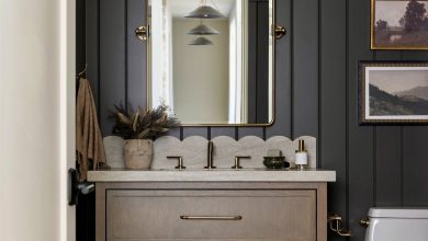 This bathroom blends the luxurious feel of marble with soft pink walls for a design that’s both elegant and warm. The gold fixtures and accessories infuse a touch of opulence into the small space, while the artwork and plants add personal touches that evoke a spa-like ambiance.