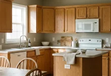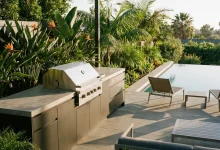The open-plan idea pulls together the kitchen and the living room, giving prominence to a slim black sectional. Huge glass sliding doors let a lot of light into the room and the simple tiled floor and modern furniture help the area look both relaxing and beautiful. It is a great design for homes where entertaining and living daily happen inside the same space. The beige stools, ceramic vases and neutral throw pillows create a cozy atmosphere where people want to sit and talk.