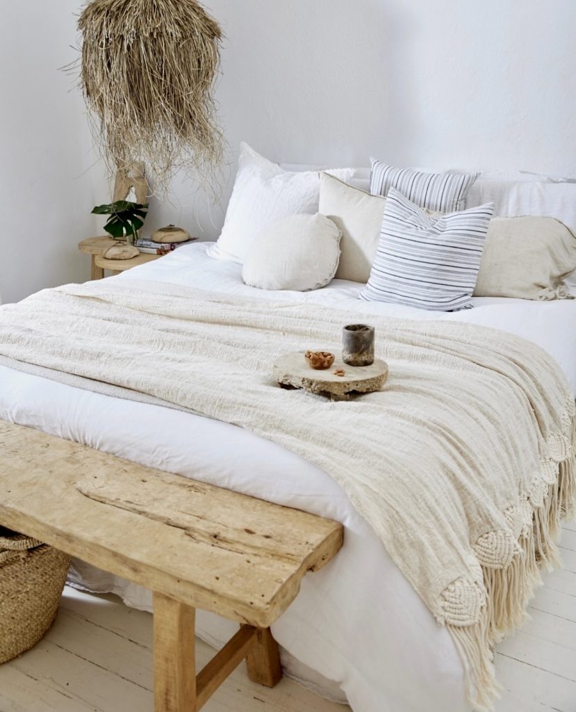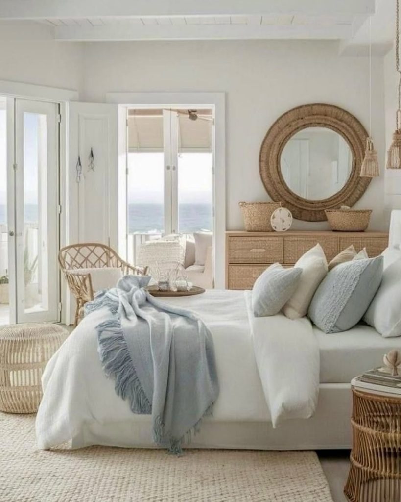 The beauty of a minimalist beach retreat is captured with this bedroom with its multi-layered neutral bedding and pale blue accents. Natural woven items such as the rattan mirror, the wicker drawers, and the rough ottoman introduce a warm, earthy element that is both earthy and snuggly. The pale blanket throw tossed casually over the bed creates an easy, boho element that makes the space feel cozy without commitment. Soft light streaming through French doors amplifies the sense of open space, helping to make this perfect for the smallest rooms that require an airiness. It’s a style that can be made affordable by focusing on key textures and a simple palette of white and sandy tones. Many decorators call this look timeless because it combines modern comfort with the easy charm of natural materials.