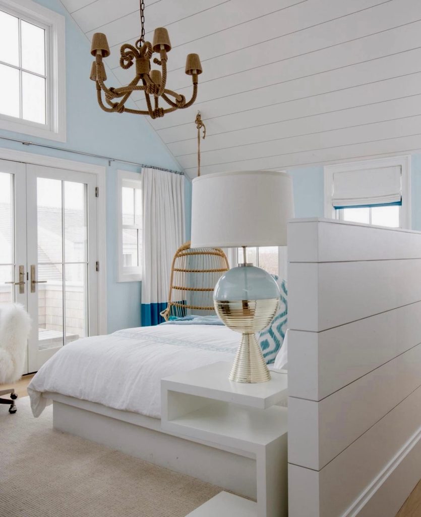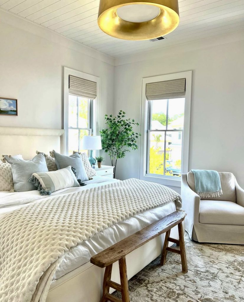 The introduction to a more sophisticated end of the beach aesthetic comes with this oversized golden pendant light, giving the space a contemporary modern statement. The white and pale blue color palette is light, gentle, and preppy, with the wood bench at the end of the bed incorporating a sense of rough-around-the-edges charm. Layered fabric with quilted textures makes the space particularly inviting, ideal for adults creating a personal retreat. The plants in the corner incorporate an earthy note, keeping the space from becoming too refined. It’s a look that balances an air of sophistication with comfort, demonstrating that beach style can shine with an air that’s both accessible and luxurious. In 2026, this integration of boho textures and metallic accents is becoming popular for the design of master suite spaces that are both contemporary and enduring.
