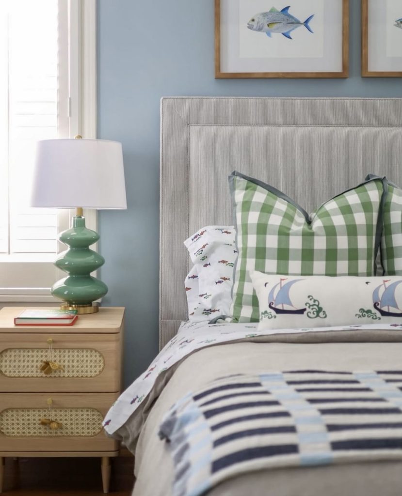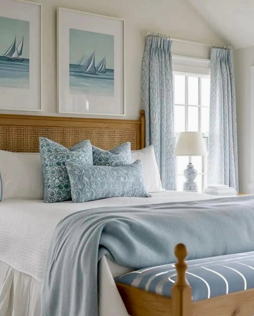 Preppy beach living comes to this bedroom through sailboat artwork and patterned drapery in pale blues. The rattan headboard adds a sense of rough warmth, with crisp white bedding keeping the space simple and minimal. Layered patterned pillows bring it all together, giving the space a refined yet inviting retreat. With this design, adults with a desire for a subtle nautical note without going overboard will find it perfect. It’s also very versatile for small rooms, where repeated color and pattern help create visual cohesion. By blending contemporary modern elements with timeless motifs, the space is ageless yet up-to-date for 2026.