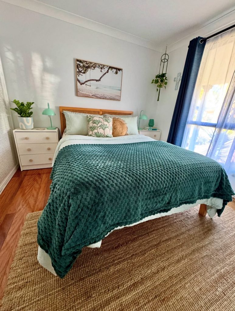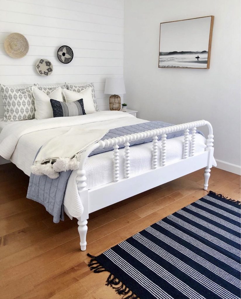 This bedroom leans into classic blue and white coastal charm with striped rugs, layered pillows, and a crisp spindle bedframe. The shiplap wall adds a rustic backdrop, while woven wall baskets introduce an earthy texture that balances the clean design. It’s an approach that feels minimalist yet cozy, making it a great option for small rooms where simplicity matters. The artwork of a surfer ties the look back to the ocean, giving it a slightly eclectic touch. This setup would work beautifully for teens who love a preppy coastal vibe as much as for adults looking for timeless comfort. It’s a design that shows how affordable updates, like new textiles and art, can completely refresh a room.