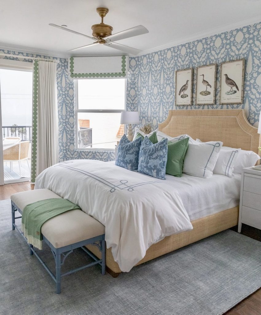 This space leans into patterned wallpaper and layers of blue textiles for a dramatic, contemporary, modern coastal vibe. The rattan headboard balances the ornate details with an earthy texture, while crisp white bedding keeps the room feeling grounded. Pops of green in pillows and trim add a preppy sophistication that feels timeless yet updated for 2026. This design is ideal for adults creating a bold master suite, as it combines elegance with a sense of ease. Even though it uses rich details, the layout remains minimalist enough not to feel overwhelming. By combining boho textures with classic prints, the room achieves a balance between comfort and style.