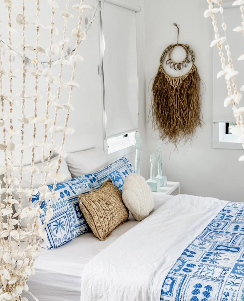 This bedroom captures a bohemian coastal aesthetic with its shell bead curtain, woven wall hanging, and bold patterned bedding in blue and white. The natural fibers bring an earthy warmth, while the textiles introduce color and pattern in a way that feels eclectic and relaxed. It’s a style that works especially well for teens or for small rooms, where personality and texture can take center stage. The mix of shells, raffia, and woven materials makes the room feel adventurous yet cozy, like a beach getaway. It’s an affordable style, as most of the impact comes from layered decor and textiles rather than heavy furniture. This look embodies carefree living while still feeling intentional, making it a perfect expression of coastal design in 2026.