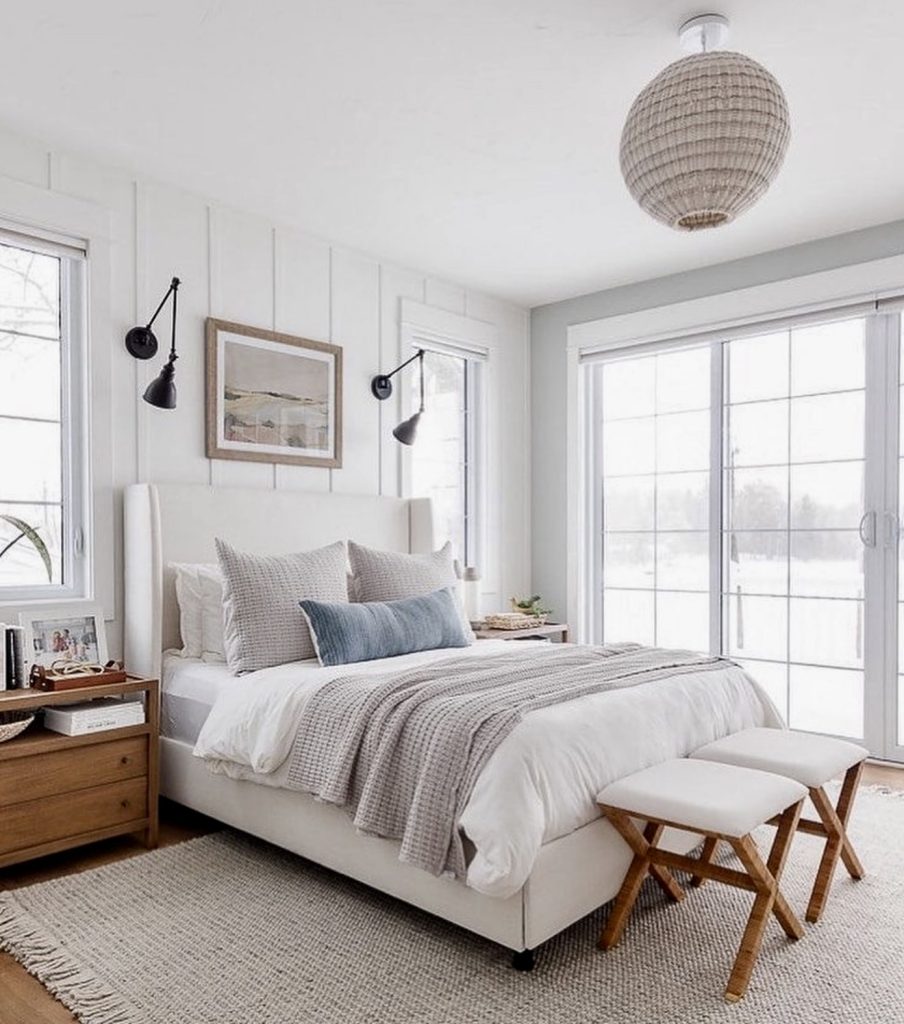 This bedroom embodies a minimalist coastal design with its clean lines, crisp white bedding, and subtle touches of blue. The woven pendant light and textured rug introduce an earthy quality that softens the modern simplicity. Wood nightstands add rustic warmth, creating a perfect balance between clean and cozy. This space works beautifully for adults designing a serene master suite, but it also adapts well for small rooms with its uncluttered layout. The layering of neutral tones makes the room feel both affordable and timeless, proving less can truly be more. Its straightforward elegance shows how contemporary modern coastal style will continue to shine in 2026.