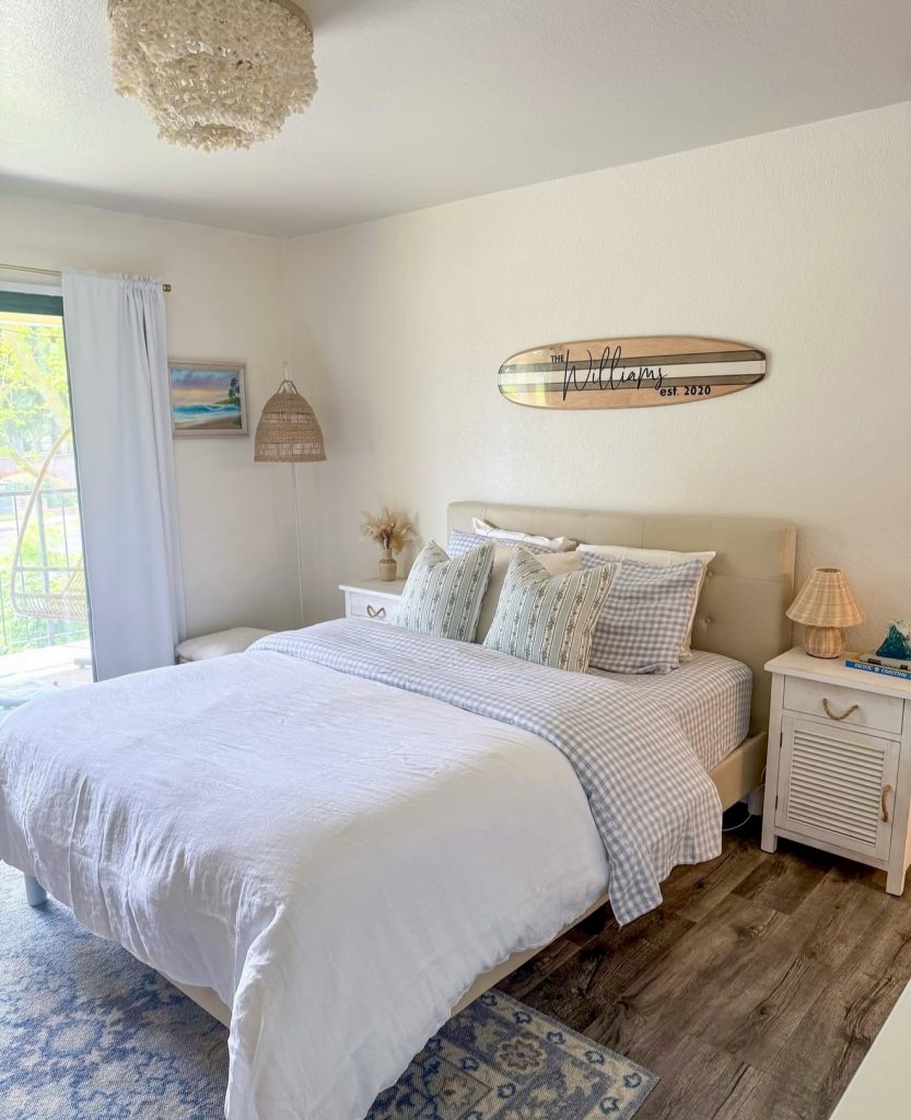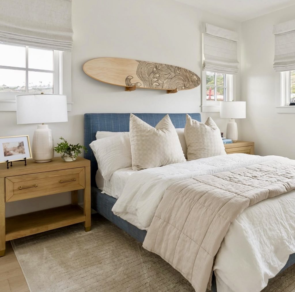 Here, the focus is on personality, with a custom surfboard wall feature that brings a playful, eclectic energy to the room. The checkered bedding and natural textures keep things cozy, while layered pillows add depth without overwhelming the simple palette. Whitewashed furniture enhances the light, airy mood, perfect for small rooms or casual guest spaces. This look works equally well for teens who want a cute, beach-inspired vibe or for adults seeking a laid-back retreat. The mix of textures and personalized art makes it feel bohemian, approachable, and highly livable. By blending personal storytelling with modern simplicity, it captures the heart of coastal living.