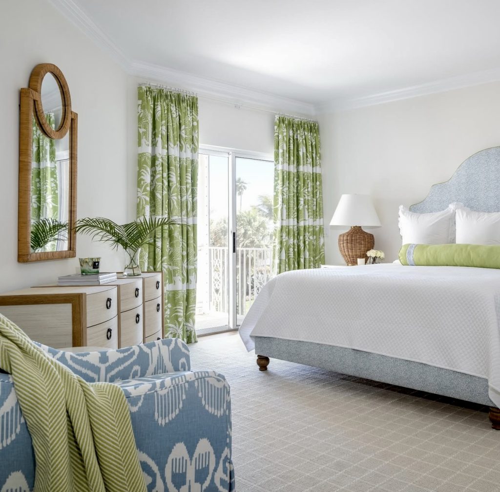 Taking a bolder turn, this bedroom’s patterned green drapes and blue accents join to create a vibrant but cohesive color palette. The pale blue upholstered headboard matches the crisp white bedding for a preppy aesthetic. The rattan lamp and mirror inject warm, earthy touches to anchor the colorful elements. The look is perfect for adults preparing an eye-catching master bedroom that’s both vibrant and elegant. It’s also an inspiration for bloxburg or Toca Boca creations, where playful color combinations dress up rooms to be trendy. With the integration of dramatic prints with natural textures, the space receives both the ultimate dose of eclectic fun and outdoor glamour.