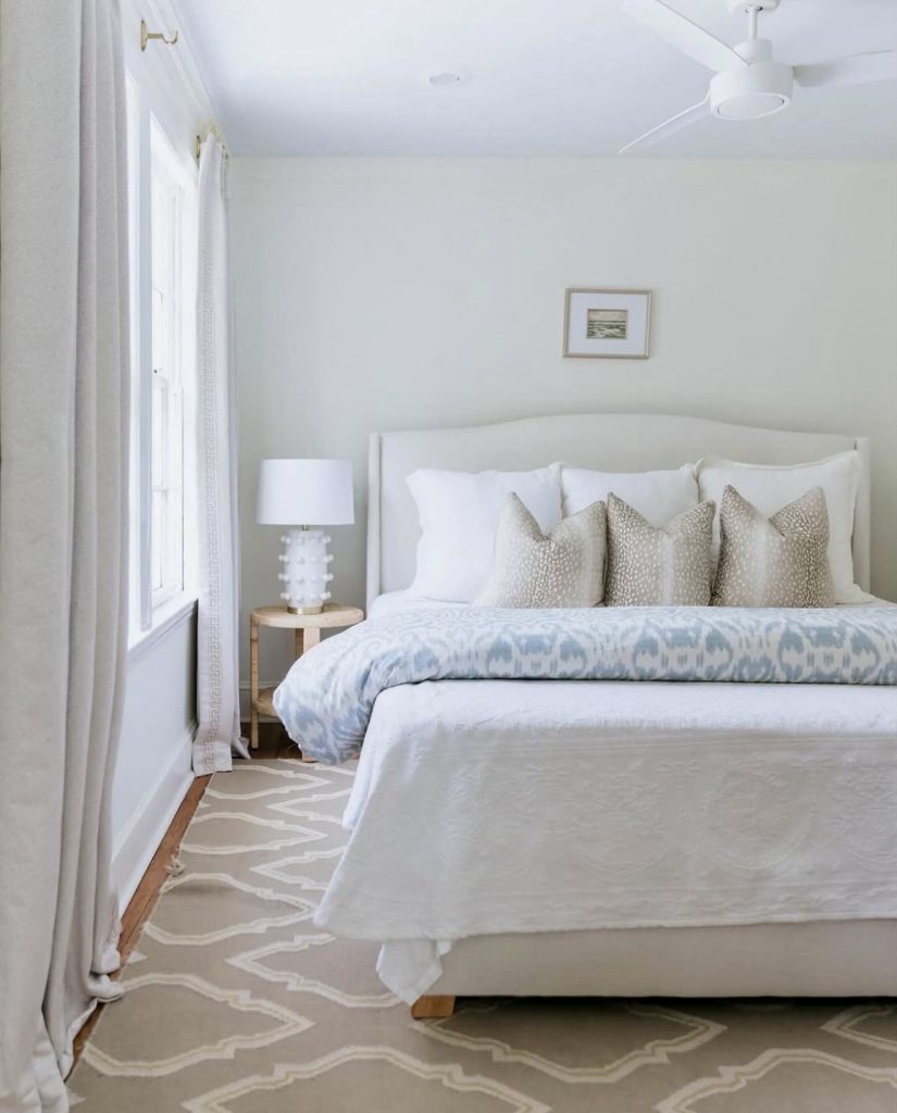 The bedroom is serene with the pale neutral walls, layers of fabric, and simple color palette of pale blue and white. A knitted throw adds warmth and texture to the space, keeping it warm without an essence of clutter. Big wall art imitates the beach, giving the space a contemporary timelessness. The design is especially ideal for adults that desire a serene retreat for the master suite that is free from clutter. Its simple color palette allows it to easily reformulate in small rooms, where minimalism amplifies the sense of openness. The end result is a serene retreat that combines boho softness with contemporary modern succinctness.