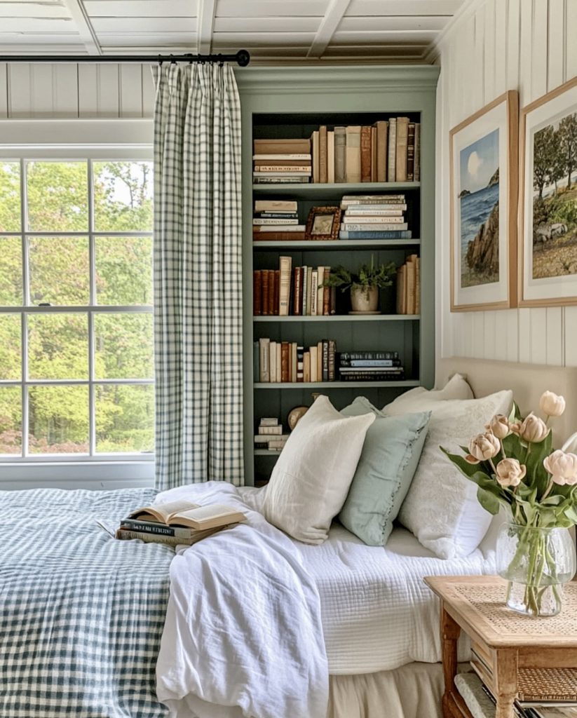 This room leans into vintage cottage charm with its sage green and blue built-in bookshelf and checked fabrics that feel instantly cute and welcoming. The bedding and curtains introduce a playful, preppy energy, while the bookshelf filled with worn novels and art adds depth and history. It’s the kind of room that works beautifully for teens who want an aesthetic yet functional space with personality. The soft bohemian vibe is enhanced by fresh flowers, giving the room a lived-in and approachable appeal. By mixing storage with design, it also becomes a practical choice for small rooms, where every inch must work harder. This is a look that feels layered and eclectic, proving that coastal style can be both personal and cozy.