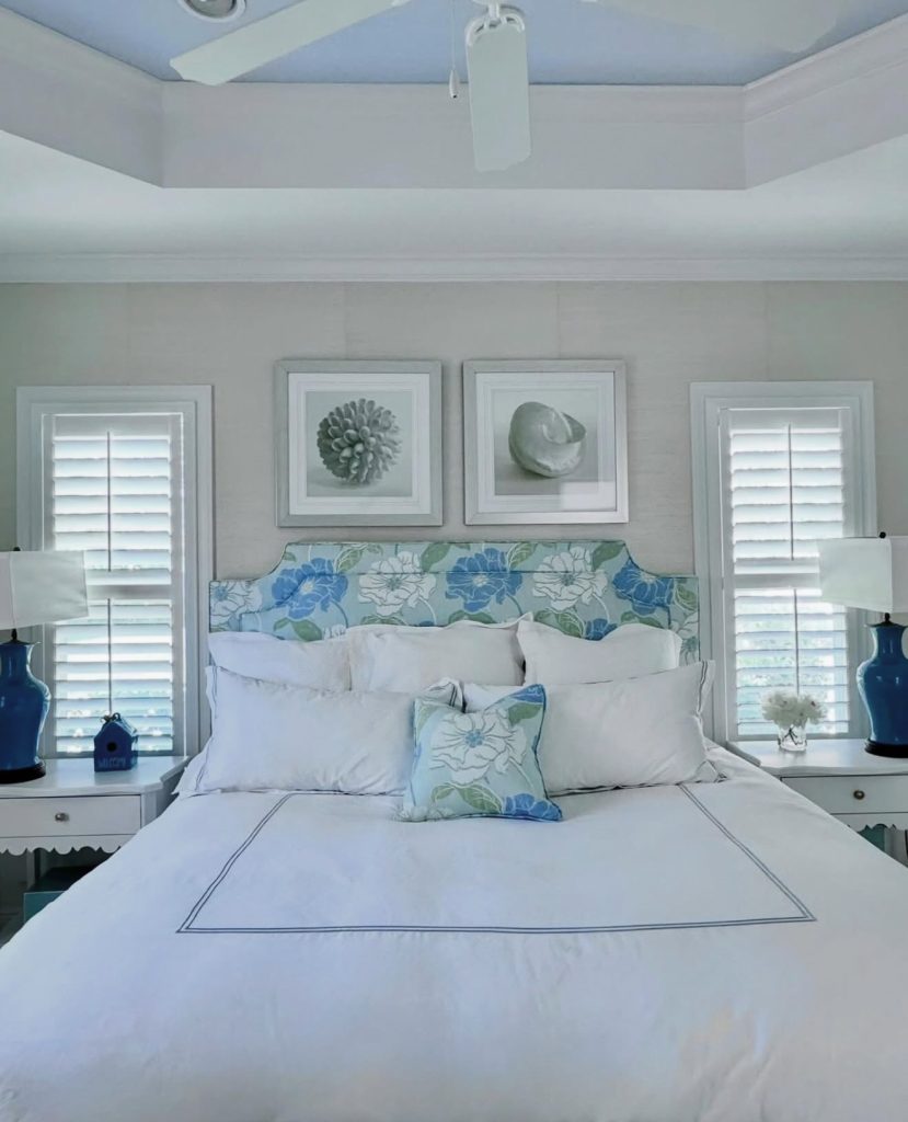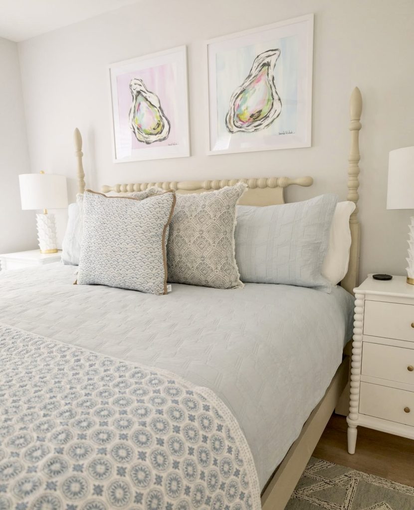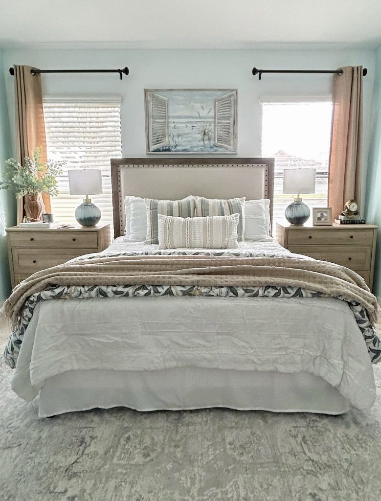 Soft coast tones are paired here with whimsical, colorful art above the bed that instantly adds personality. The colored patterned quilt and pillows incorporate the blues to keep the space coast-inspired. A spindle-style bed frame introduces a hint of vintage charm, while white nightstands and lamps ensure a contemporary modern balance. This design feels versatile, working well for teens who love an aesthetic touch as much as for adults creating a personal retreat. It’s an approach that blends boho layering with preppy crispness, offering both fun and sophistication. In 2026, this style shows how coastal bedrooms can embrace art and individuality without losing their cozy core.