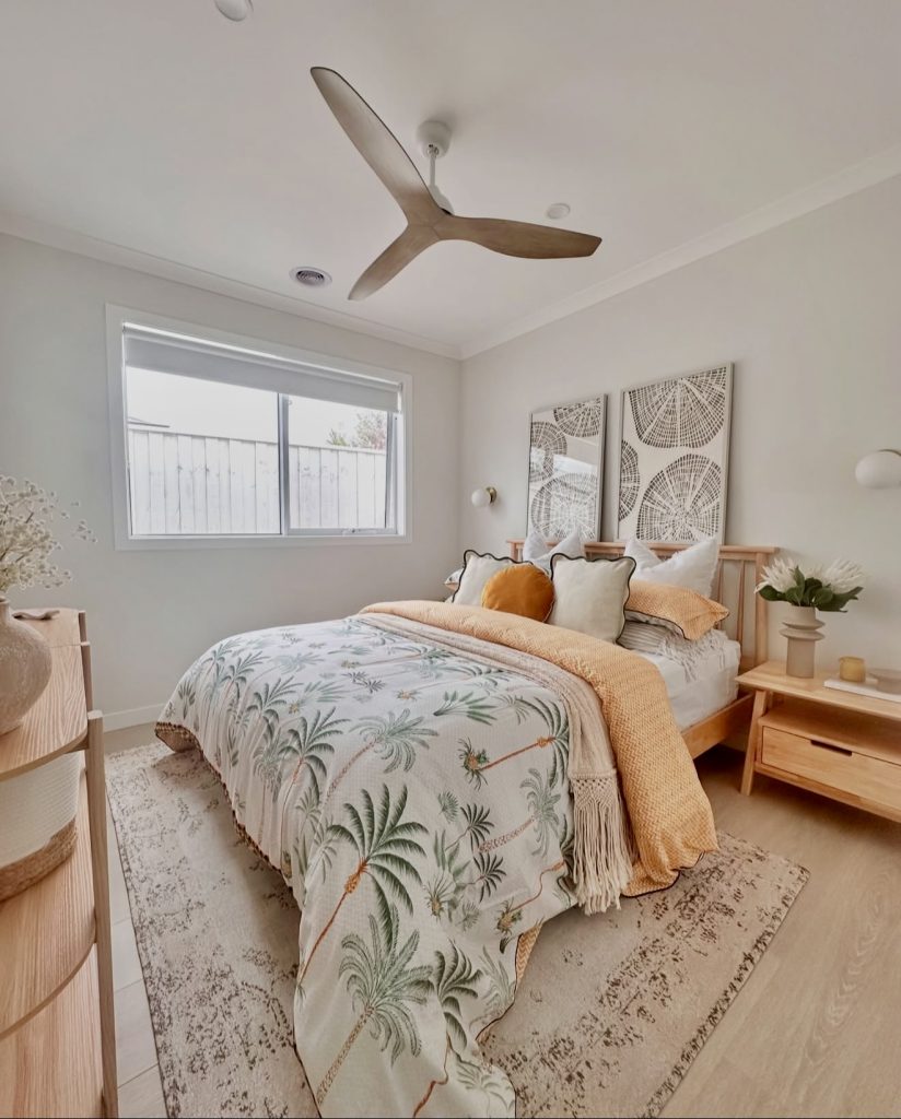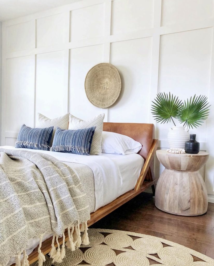 The bedroom achieved an earthy and the latest simplicity with a leather headboard accentuating crisp, white bedding. The warm, weathered throw and the patterned pillows warm it up, with the rounded rug and the wood side table creating an earthy, bohemian feel. The simple color palette determines that it is minimal, but the multi-layered element creates the cozy, friendly atmosphere. The look is perfect for the adults that are planning the natural, retreat-like master bedroom, yet it’s versatile for the small rooms. The palm fronds in the vase are the subtle tropical reference, combining the rustic with the latest contemporary touch. It’s a style that is trendy, budget-friendly, and classic for 2026.