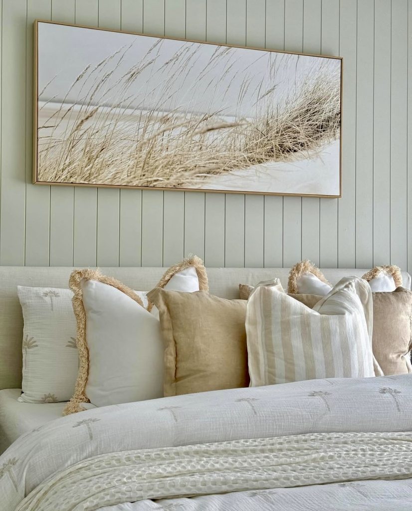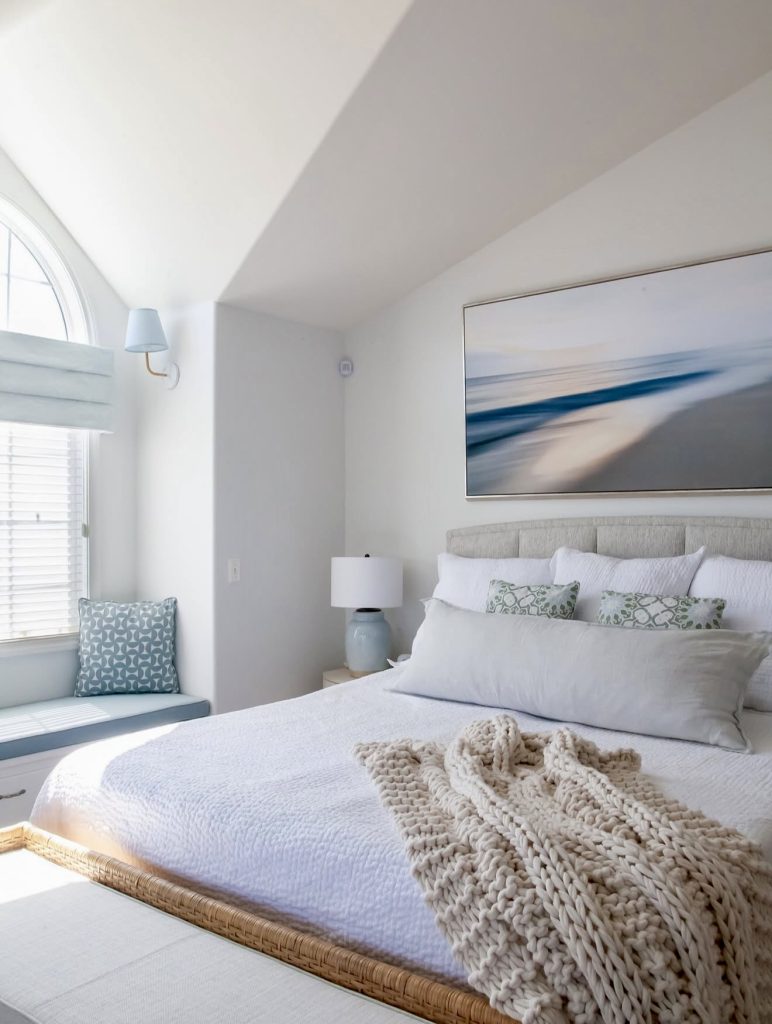 This bedroom embraces earthy and neutral tones, leaning on texture rather than bold color for impact. The layered pillows in shades of beige and cream are accented with fringed edges, adding a tactile richness that feels bohemian yet refined. A coastal landscape above the bed anchors the design, bringing a modern and calming presence to the space. This is a style that works perfectly for adults looking for a serene master suite with understated elegance. Its minimalist use of color is balanced by a variety of cozy textiles, proving that subtlety can be deeply stylish. The combination of rustic warmth and contemporary modern restraint makes this one of the most timeless coastal approaches for 2026.