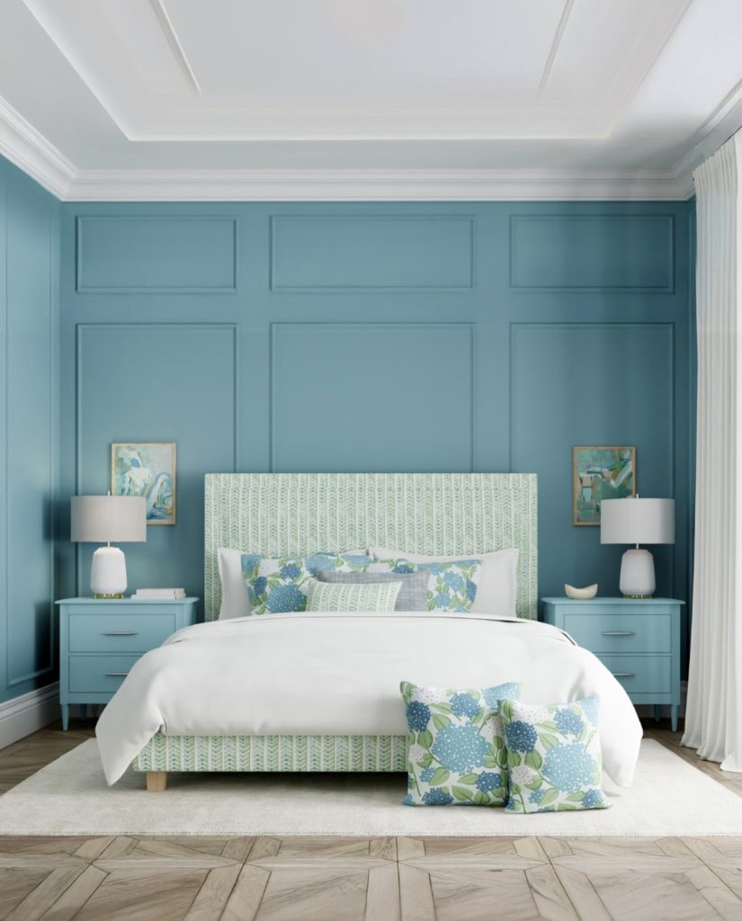 The design aims for dramatic with blue-painted walls, the ultimate kickstart for an ultra-preppy beachy style. The patterned headboard and floral pillows combine the blues and greens for a bright and cheery look. Symmetrical matching nightstands and lamps maintain the shine, with white bedding keeping the color palette balanced. The plan is perfect for adults looking to create a dramatic master bedroom that is, however, warm. It’s also an entertaining inspiration point for bloxburg creations, where color-blocking creates dramatic rooms. The merging of contemporary architectural styles with time-old designs creates for this bedroom a whole new definition of beachy sophistication.