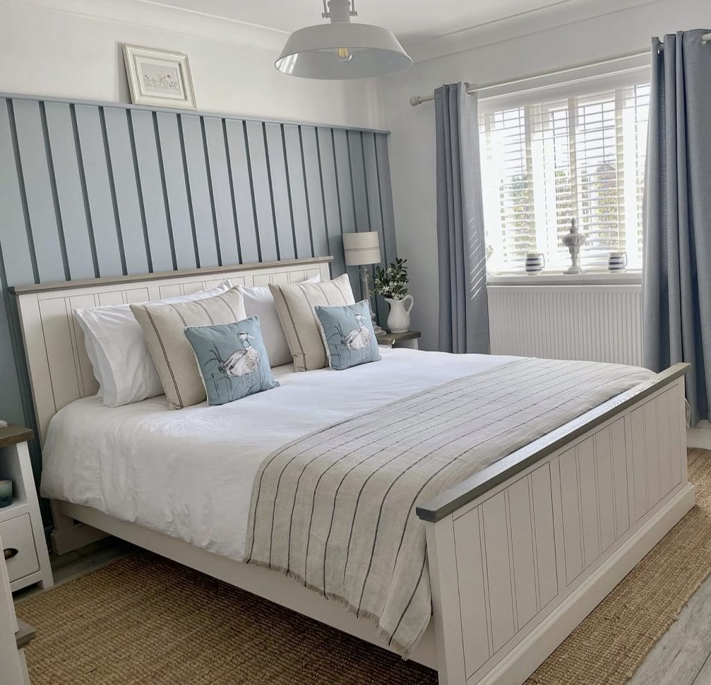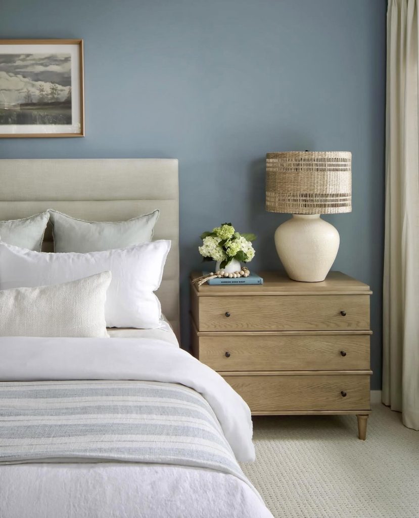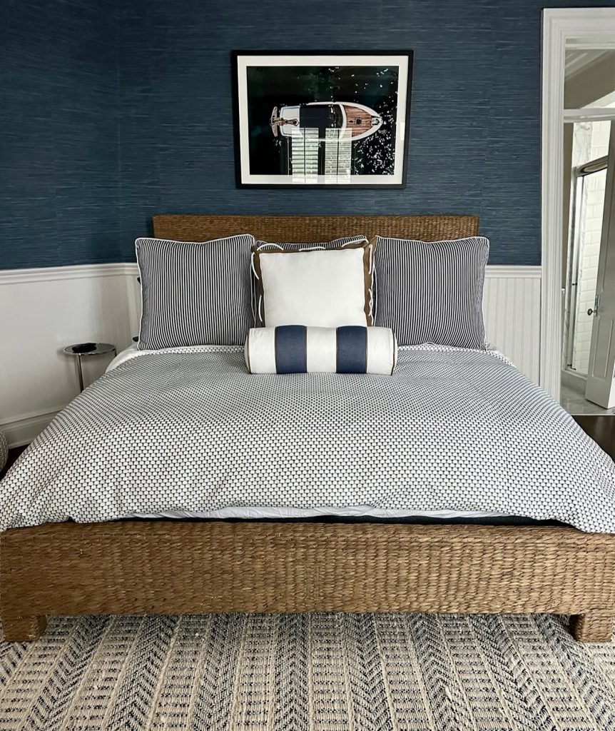 This bedroom leans into classic nautical style with deep blue walls, a woven bed frame, and striped accents. The combination of textures feels both rustic and modern, appealing to those who love bold yet balanced interiors. A framed boat photograph reinforces the theme, while layered bedding keeps it cozy. This room works just as well for teens who enjoy a themed, aesthetic space as it does for adults who prefer a sophisticated master suite. The palette shows how preppy coastal style can still feel affordable and versatile. It’s an enduring design that will stay relevant in 2026.