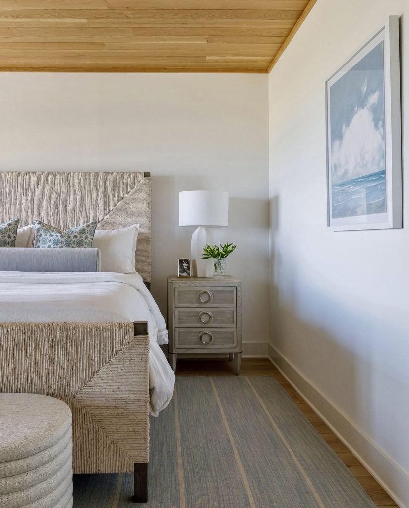 The bedroom goes for the serenity that coast living is all about with the bed that is framed with the textured neutrals and has companionship with the soothing blue. The natural wood ceiling adds warmth and connects the room to an earthy coastal aesthetic. Simple artwork and a striped rug bring balance, proving that minimalist design can still feel cozy and welcoming. It’s a look that works beautifully for adults who want a serene master suite while remaining adaptable for small rooms. The clean lines also give it a contemporary modern appeal without feeling cold. This style is timeless, affordable, and effortlessly chic for 2026.