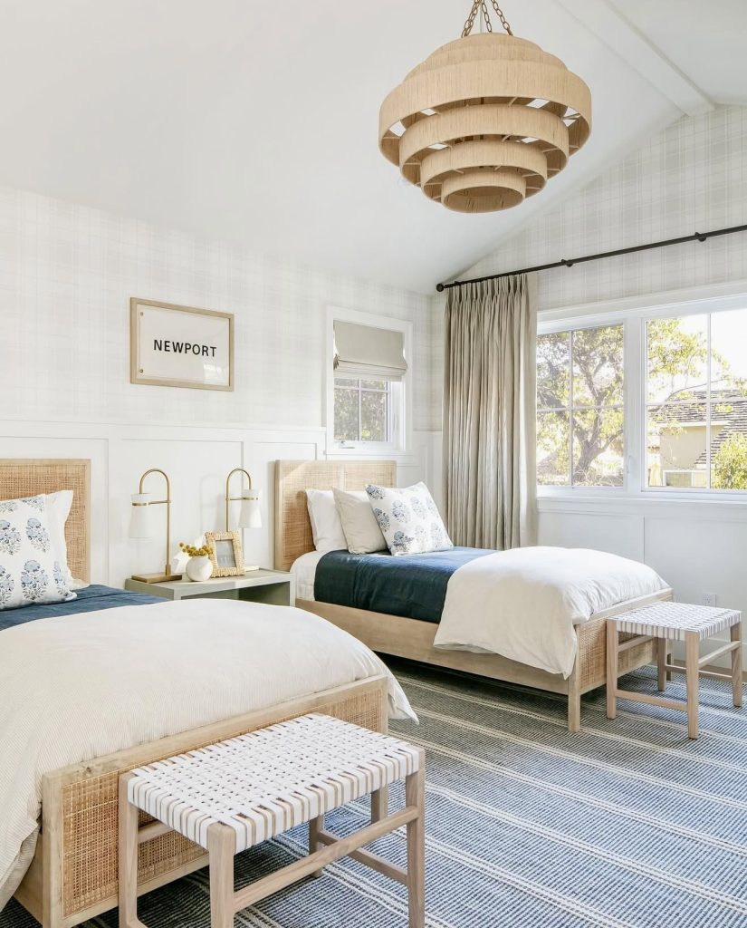 Here, a room designed with twin beds feels both cute and practical, perfect for teens or guests. Rattan headboards and woven benches add rustic charm, while crisp white and navy bedding provides a preppy nautical touch. A layered rug pulls the scheme together, making it functional yet stylish for small rooms. This setup also doubles as inspiration for Bloxburg, where symmetry and smart layouts matter in compact builds. Brass lamps and a bold chandelier add a modern edge, ensuring the space feels updated. It’s a cozy coastal design that balances personality with practicality.