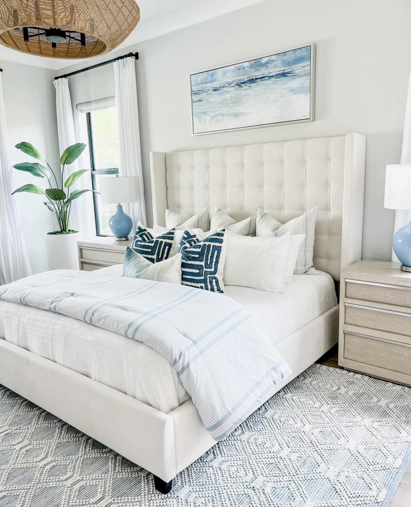 This bedroom blends bright light and fresh textures, with a tufted headboard in white anchoring the design. Blue patterned pillows and ocean artwork create a boho-inspired yet modern mix. The rattan light fixture adds a rustic coastal vibe, while layered rugs bring in subtle neutral grounding. It’s a versatile space, equally suited for adults designing a master suite or for teens who want a breezy, aesthetic room. The pops of turquoise give it a playful, colorful edge without overwhelming the design. Overall, this is a polished, cozy, and stylish coastal bedroom idea for 2026.