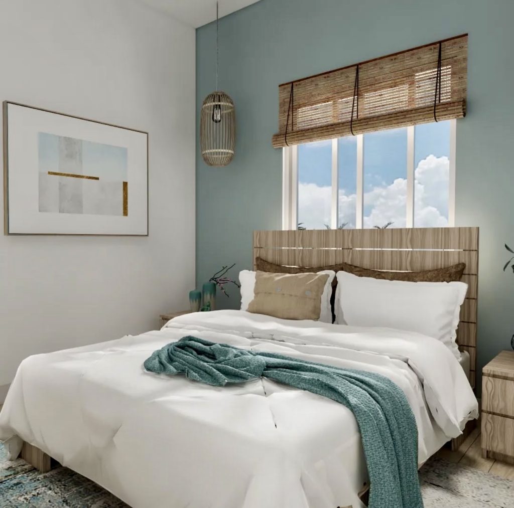 This room shows how minimalist design can still evoke a coastal feel, with clean walls, woven blinds, and muted accents. The muted teal wall provides a soft sage green and blue backdrop, grounding the space in nature. Neutral bedding layers create a cozy retreat that’s functional for small rooms. Touches like the rattan pendant light and modern artwork add just the right amount of contemporary modern flair. It’s a look that feels affordable, adaptable, and practical for adults who want simplicity with style. This design embodies understated elegance while staying true to coastal charm.