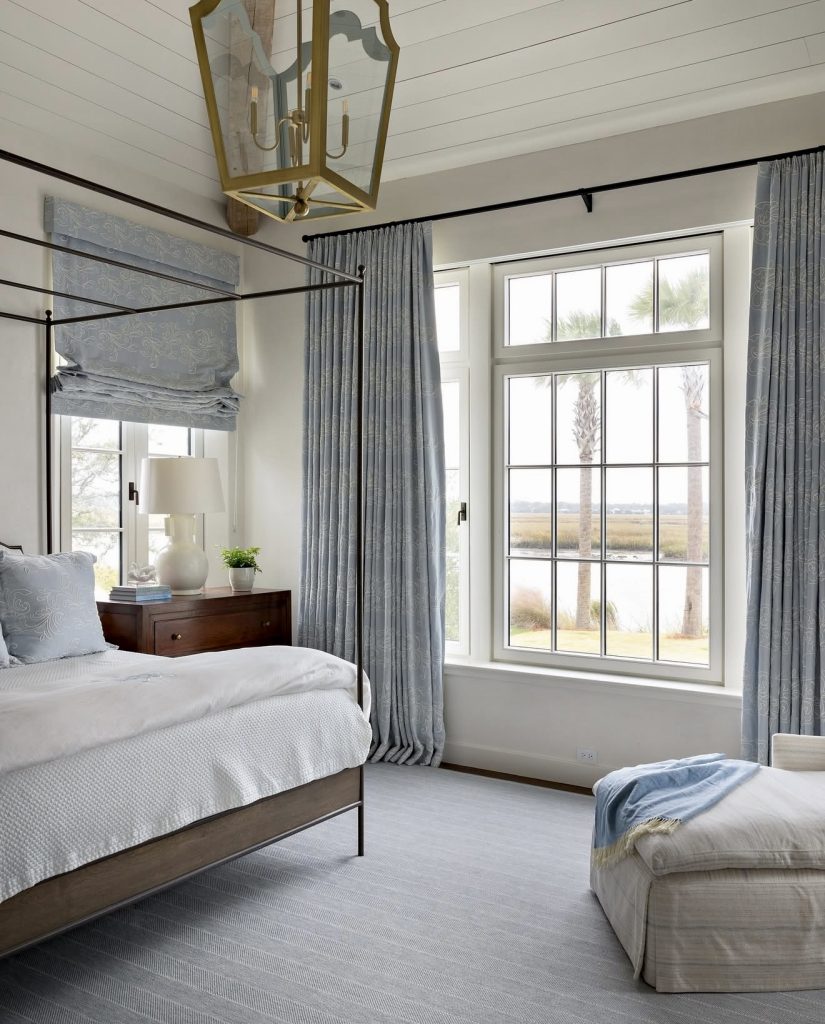 The space celebrates the beauty of natural light with tall windows flanked with flowing blue drapery to set the mood for coastal serenity. The white canopy bed and coordinating ottoman keep the look clean and minimal, with subtle texture in the bedding that brings gentle sophistication. Layered fabric and cozy throws add a boho touch that invites the space without overwhelming the architecture. For homeowners creating a master suite, this breezy configuration is a private retreat without losing the ease. Even for the smallest rooms, taking tall drapes with soft hues creates an optical illusion for the sense of height and grandiosity. The mix between earthy wood accents and contemporary lighting creates a fresh balance that exudes the perfect 2026 feel.
