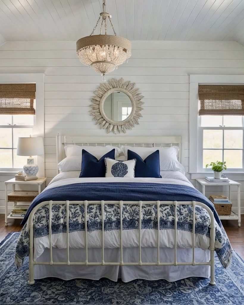 The blue and white blend with a coastal inspiration that creates a classic but adorable coastal style. The vertical board-and-batten panel painted with gentle blue adds height to the space, with the striped bedding and bird-themed pillows giving a sense of character. The wicker flooring and neutral furniture stabilize the design with an earthy texture. It’s a design that also suits teens fond of beachy subject matter or adults planning for a light, airy master bedroom. The color palette makes it budget-friendly and flexible, particularly for small rooms where the color palette can give the space the illusion that it is bigger. Generally, it combines the preppy element with the rural charm, perfect for a timelessness designed for coast homes.