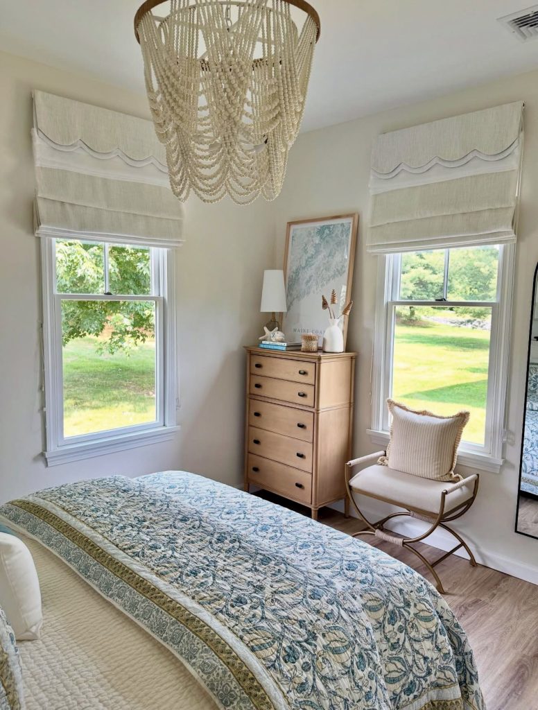 The room expresses the softer side of beachy design, with neutral colors stacked through bedding and subtle explosions of light blue through the pillows. The modern chandelier above the bed creates the contemporary flair, with the wood furniture and fabric stools providing coziness with an earthy element. The artwork above the bed adds a serene water view, bringing the space back to its beachy roots. The plan is perfect for adults looking to create a serene and warm master bedroom without unnecessary pattern or clutter. It’s also a style that is easily toned down for smaller rooms, where the color palette is restrained, causing the space to look larger. The simplicity-comfort balance summarizes the 2026 minimalistic coast style.
