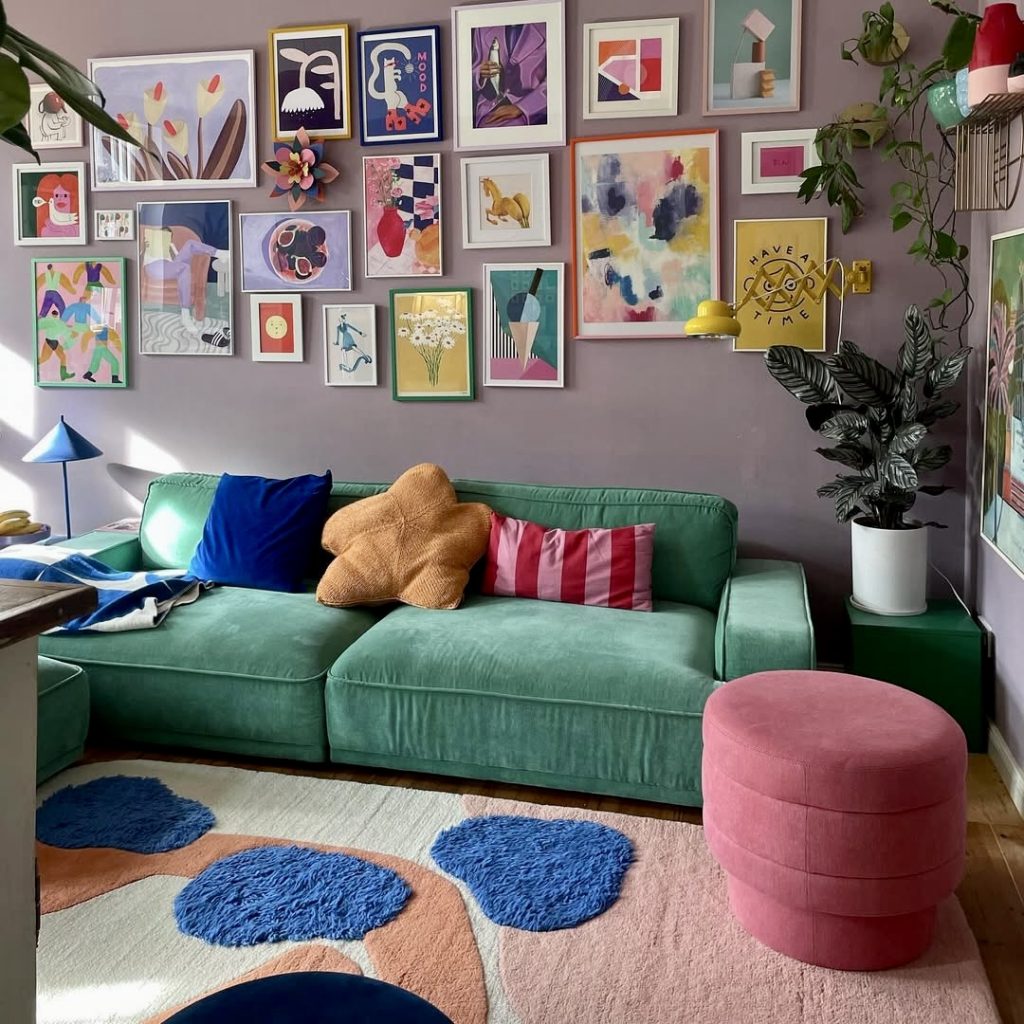 This living room embraces the aesthetic power of a statement interior wall by transforming it into a curated gallery. The lavender wall features a mix of prints displayed in creative frames to create a spontaneous rhythm throughout the space. The emerald sofa creates an earthy foundation before playful throw pillows and a sculptural yellow lamp join the emerald sofa to add whimsy to the scene. Touches of green and graphic lines make this a room that feels both playful and polished – a dream setup for those who want an everyday decor idea that feels like a modern art installation.
