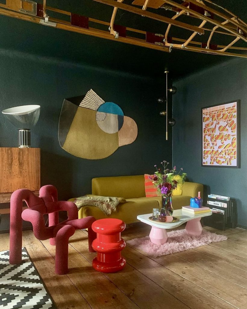 This dark, dramatic living room flips the script on the light trend by exploring the power of contrast. The walls are given a deep interior color to create an enclosed environment, while the bold hues of mustard, fuchsia and cherry red furniture break up the darkness with vitality. Abstract wall art and sculptural pieces consisting of looped red seating and a round lacquered stool design both experiment with form alongside color. The space demonstrates impeccable maximalist self-control by placing texture tone and materiality on par with color choices. Ideal for those who lean toward avant-garde style but still crave cozy, livable luxury.