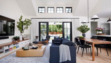 Here’s a great example of how natural light and soft neutrals can work with color in a subtle, lived-in way. Copper inspired the rust-colored sofa and footstool, which create a cozy atmosphere while keeping the rest of the room creamy white. This room takes on an academic vibe with its mix of intellectual elements such as books and floral decorations, and a vintage-style rug that perfectly matches the color of the sofa. A lone bookshelf installed on the interior wall transforms a useful space into something visually appealing. Such an arrangement is ideal for people who need comfortable spaces and interesting interiors in their homes. It’s not about loud color – it’s about the right color in the right place.