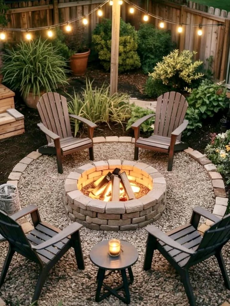 This charming setup shows how inviting a fire pit can feel when built around simple materials and smart layout decisions. The stone-lined pit sits slightly in the ground, surrounded by pea gravel—a cheap, easy choice that still looks intentional and stylish. Four Adirondack chairs offer relaxed seating, perfect for lingering conversations, while soft string lights overhead add warmth without overwhelming the design. It’s a wonderful example of how to craft a patio-ready fire nook on a budget, proving that comfort doesn’t require elaborate construction. Homeowners who enjoy DIY projects or want something beautiful for a small space will immediately connect with this timeless approach.