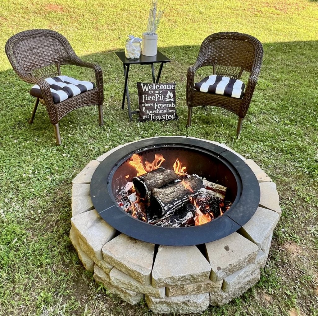 This inviting setup shows how approachable backyard design can be when comfort comes first. The circular stone fire pit has a classic brick look that works beautifully for homeowners exploring cheap DIY ideas that still feel intentional and cozy. Paired with woven wicker chairs and a small café table, the space feels personal, friendly, and perfect for evenings spent catching up with neighbors. The grass underfoot keeps things casual and low-maintenance—ideal for anyone working on a budget and wanting a layout that doesn’t require a full patio renovation. It’s a reminder that with the right seating and a warm flame, even the simplest backyard can feel like a getaway.
