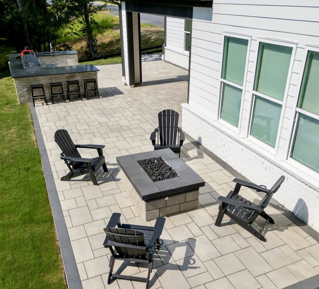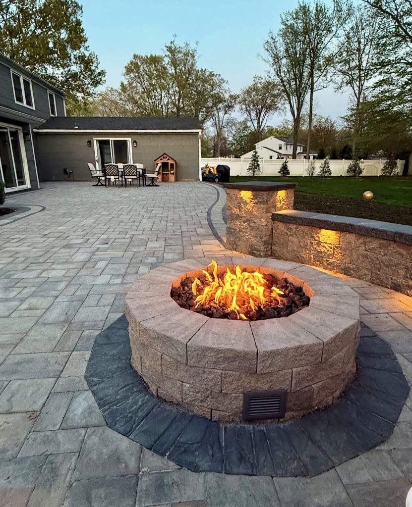 This beautifully crafted paver patio showcases how a built-in gas fire pit can bring a sense of luxury and permanence to a backyard. The circular brick structure integrates seamlessly into the paved patio, while the dark-stone accent ring adds depth and contrast. Because the design uses brick pavers, it offers impressive durability and suits homeowners looking for an upgrade that will last for years. The clean-burning flame provides consistent warmth without the mess of wood, making it a favorite among busy households who want both comfort and convenience. Soft lighting along the retaining wall completes the look, proving that even a structured layout can feel warm and inviting when illuminated thoughtfully.