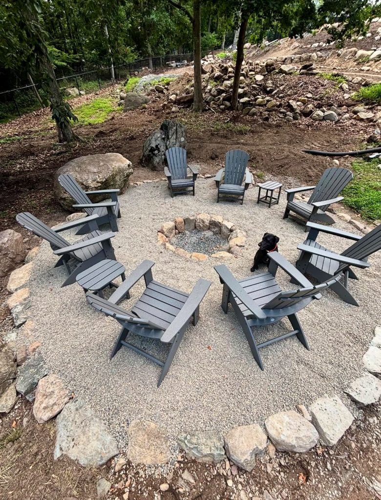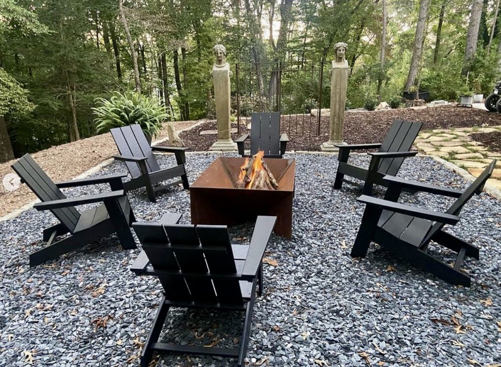 Here, a bold square fire pit brings sculptural energy to a shaded woodland yard, paired with matte black Adirondack-style chairs that echo the modern geometry. Crushed slate provides texture and acts as a cheap, easy ground cover that suits the natural landscape. What really stands out is the moody, immersive feel—perfect for anyone wanting a rustic retreat with a contemporary edge. The layout is informal yet intentional, ideal for homeowners who love the idea of a ground-level fire feature that blends seamlessly into wooded surroundings.