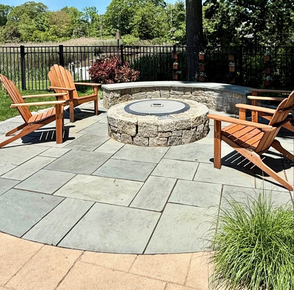 16. Stone Fire Pit with Smooth Slate Patio and Wooden Lounge Chairs