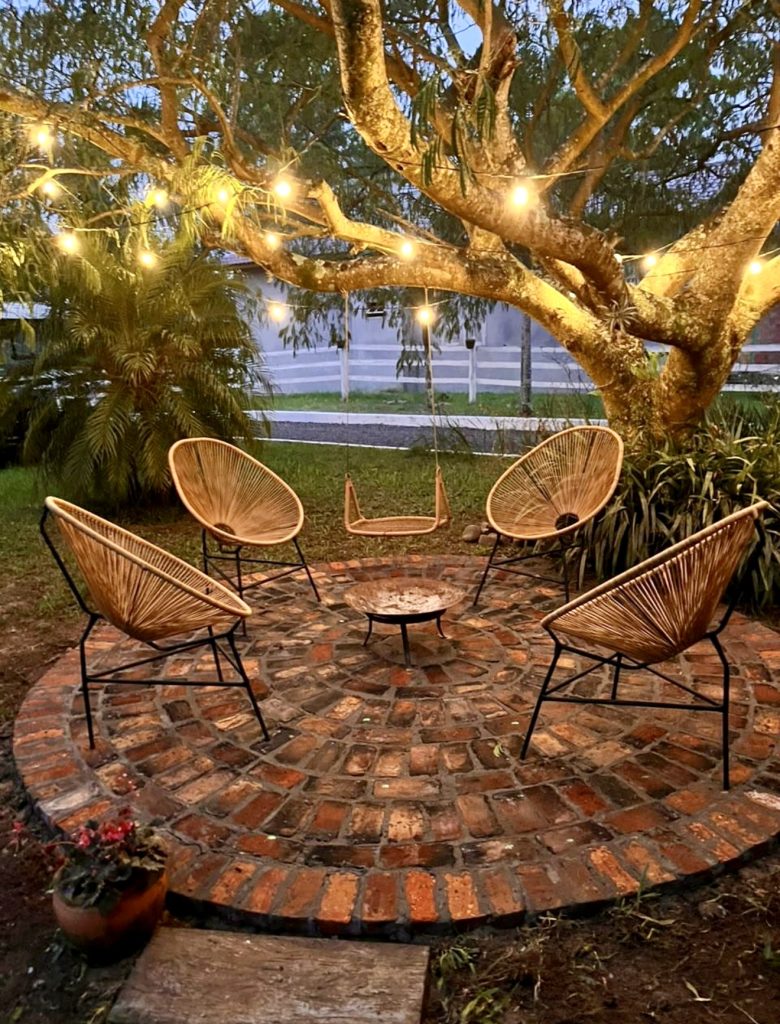 17. Brick Patio Fire Circle Beneath String-Lit Tree Canopy