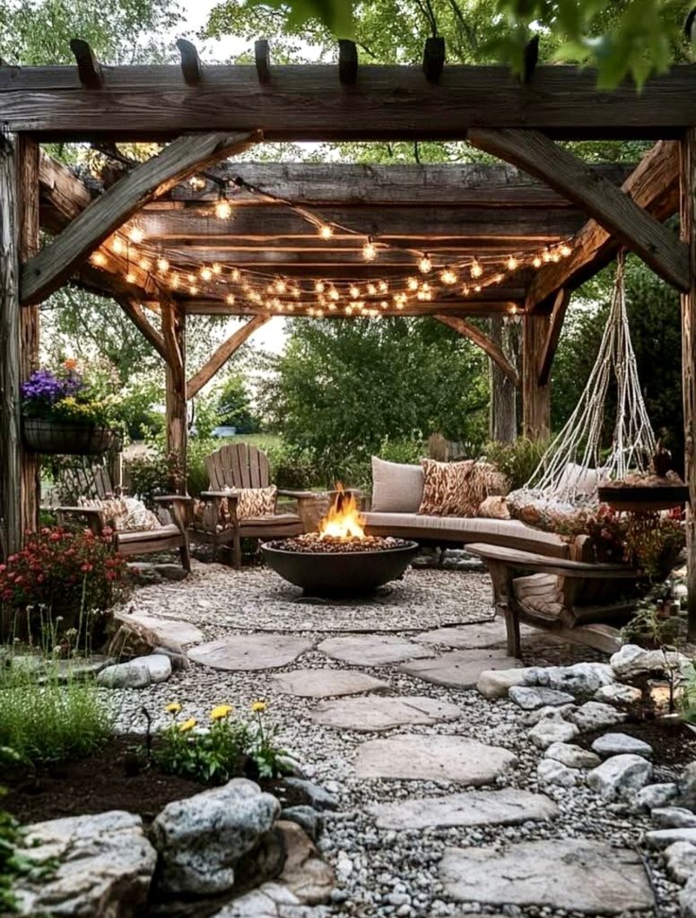 3. Rustic Pergola with Swing Seating and Stone Fire Pit