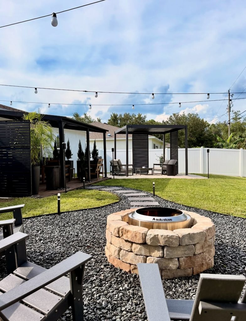 This sleek design blends modern architecture with smart outdoor living, centering around a smokeless fire pit built into a stacked-stone surround. The dark gravel ground cover gives the space a dramatic edge and works especially well for people who want something easy to maintain, even in high-traffic areas. A stepping-stone walkway ties the fire zone to the seating areas under the pergolas, making the whole backyard feel connected and thoughtfully planned. This layout is a fantastic option for homeowners seeking DIY-friendly upgrades that elevate their outdoor spaces without major construction, especially when the fire feature uses a Solo Stove for clean, efficient burning.