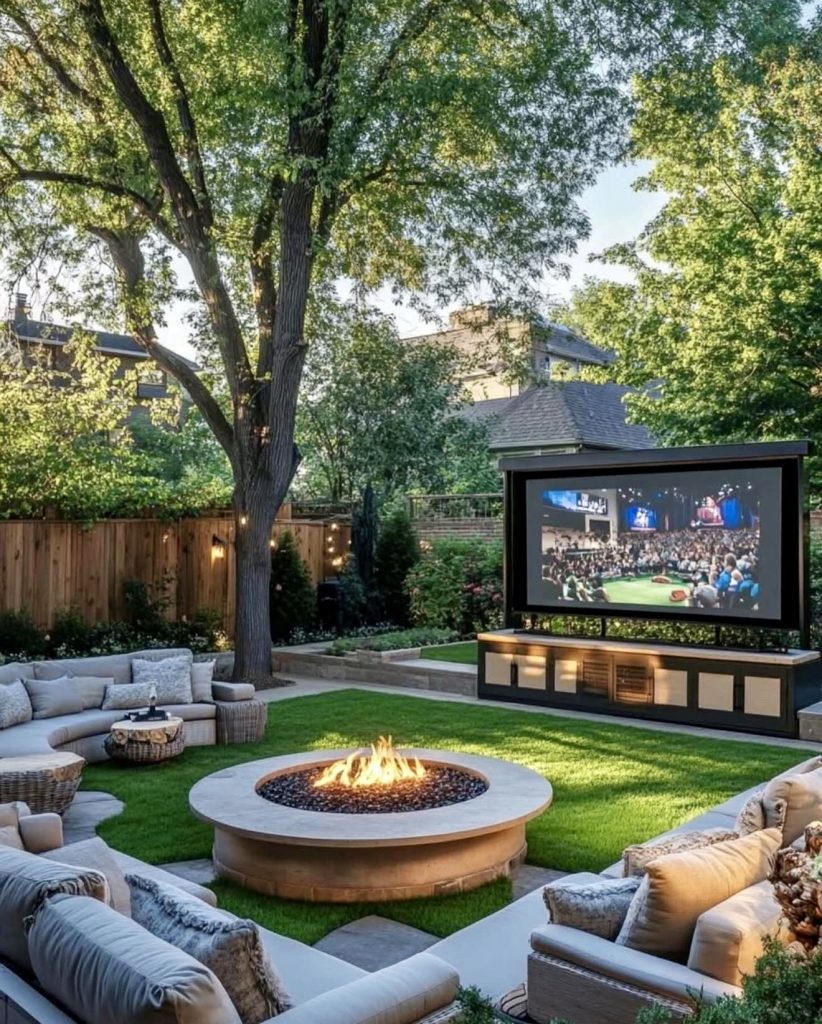 This design blends luxury with laid-back comfort, creating a dream entertainment zone for warm evenings. A broad circular fire pit anchors the space, its clean lines offering a distinctly modern feel while remaining practical for everyday use. The surrounding sectional seating creates a sunken-lounge vibe—without actually being sunken—and the integrated outdoor screen takes backyard hosting to a whole new level. This idea works beautifully for families who want a stylish retreat but still prefer something relatively easy to maintain, especially when the fire feature uses gas for reliable, smokeless ambiance. For anyone who loves transforming their landscapes into multipurpose gathering spots, this setup captures the essence of 2026 design.