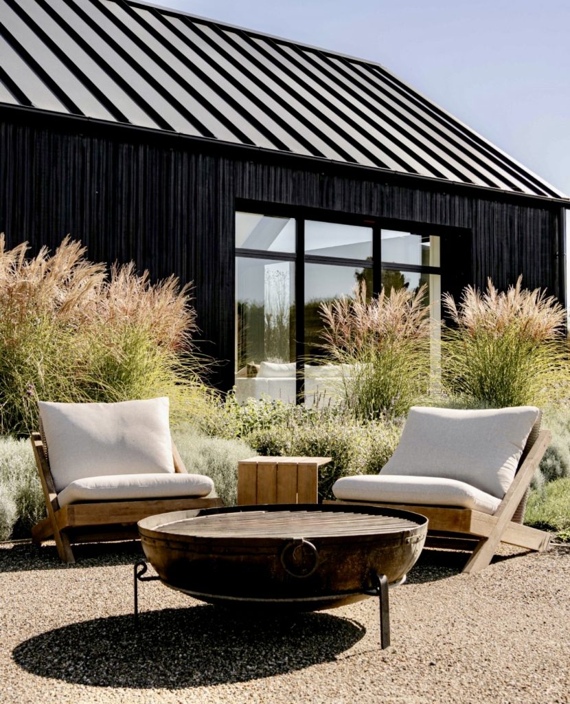 This carefully organized space showcases how effectively an amazing space can offer a peaceful setting around the fire pit with sculpted designs that keep the space totally free from all artificial material objects. The oversized metal fire pit gives an entirely handmade space, which aptly represents today’s modern need to make all objects totally handmade. Sitting in low lounge chairs placed alongside the ornamental grasses gives the space an entirely land-bred feel, as in the case of hotels. The gravel reduces aesthetic tension and ensures complete low maintenance at any cost. It easily suits the space around modern farmhouses, where the fire pit space gives both the sitting zone and the land totally combined aesthetic support.