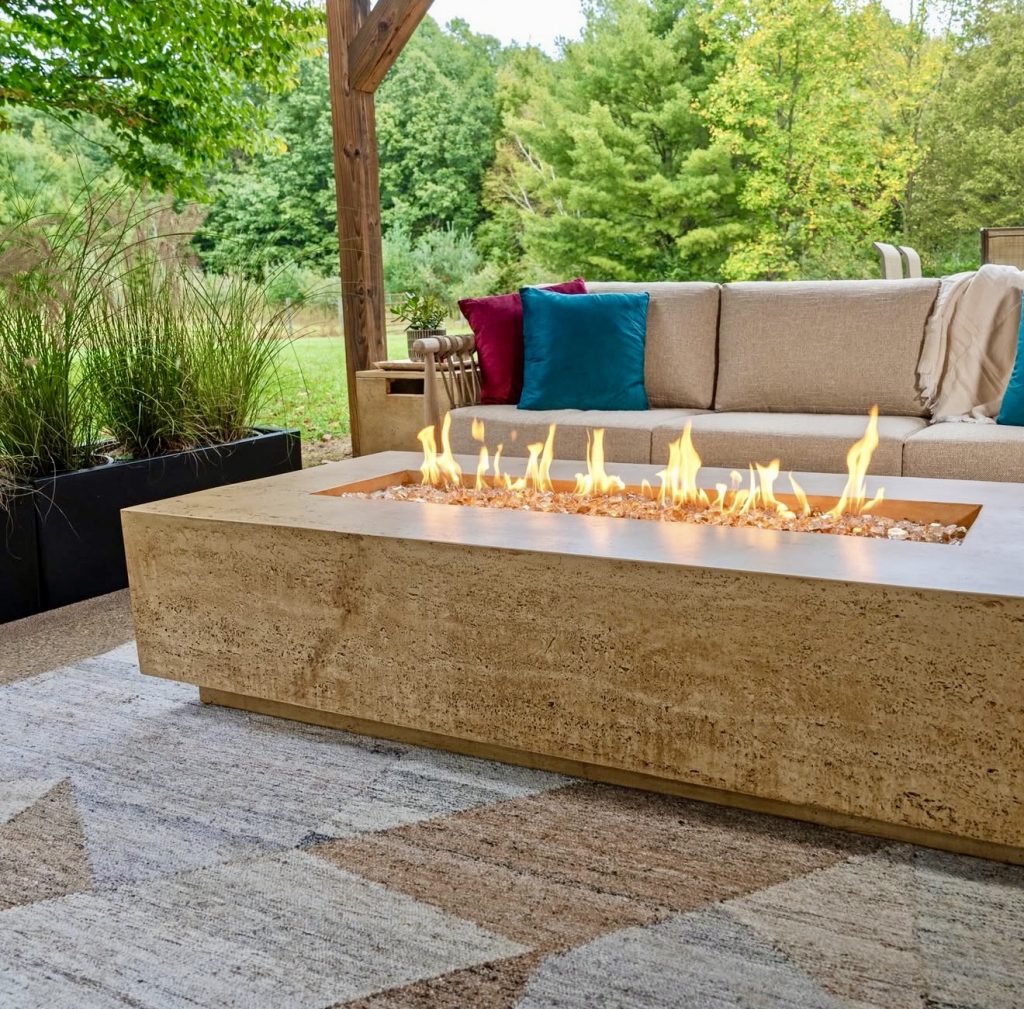 This beautifully sculpted fire feature uses a single slab of natural stone to create a striking, monolithic look that blends seamlessly into lush suburban landscapes. Its subtle flame line hints at understated luxury, showing how a modern fire pit can harmonize with nature rather than compete with it. Set atop a classic paver patio, the design works well for anyone who wants something long-lasting, elegant, and relatively easy to maintain. Because the fire pit operates on gas, it remains clean and consistent—great for families who love spending evenings outdoors without tending wood or dealing with ash.