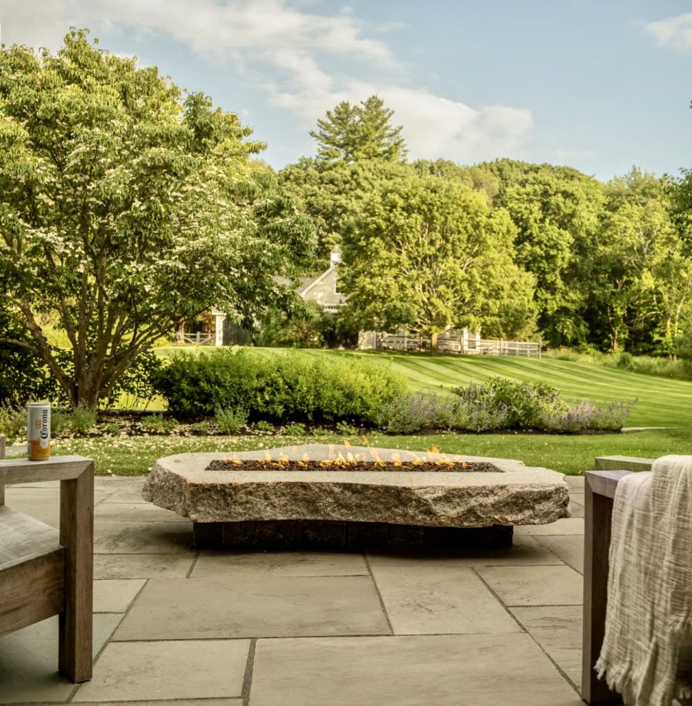 22. Carved Stone Gas Fire Pit with Expansive Lawn Views