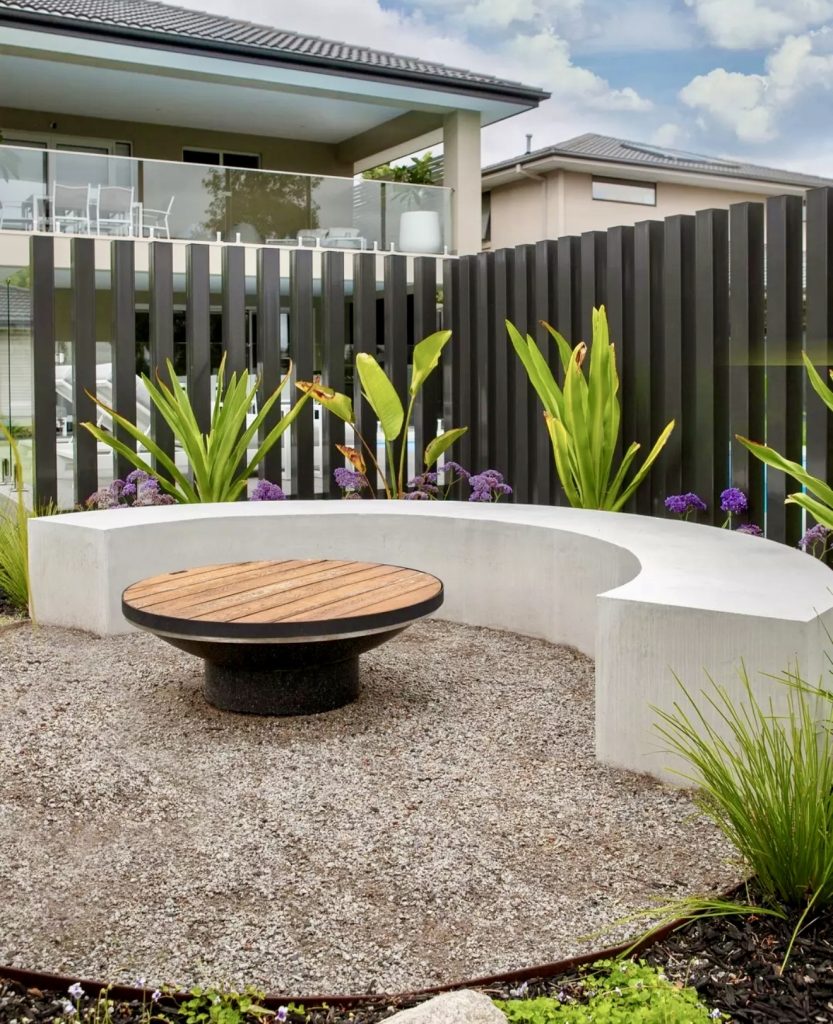 This minimalist garden design centers around a low, round fire feature set into a gravel pad, surrounded by a sculptural curved bench that immediately elevates the scene. The clean white concrete bench gives the space a modern architectural feel, while the simple gravel base keeps it on a budget and low-maintenance for everyday use. This layout is especially appealing for homeowners with small-space backyards who still want a stylish, curated atmosphere. With tropical greenery softening the edges, the result feels fresh, open, and incredibly inviting—proving that simplicity can often be the boldest design choice.