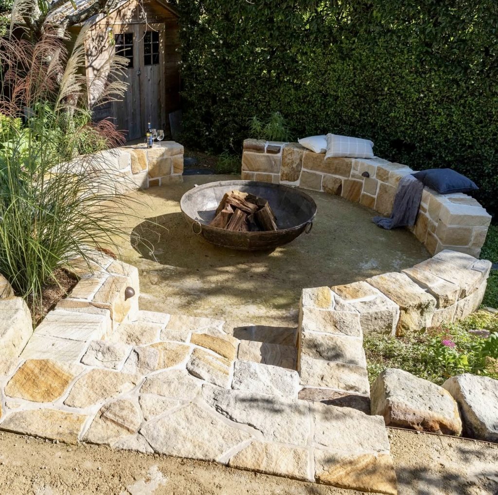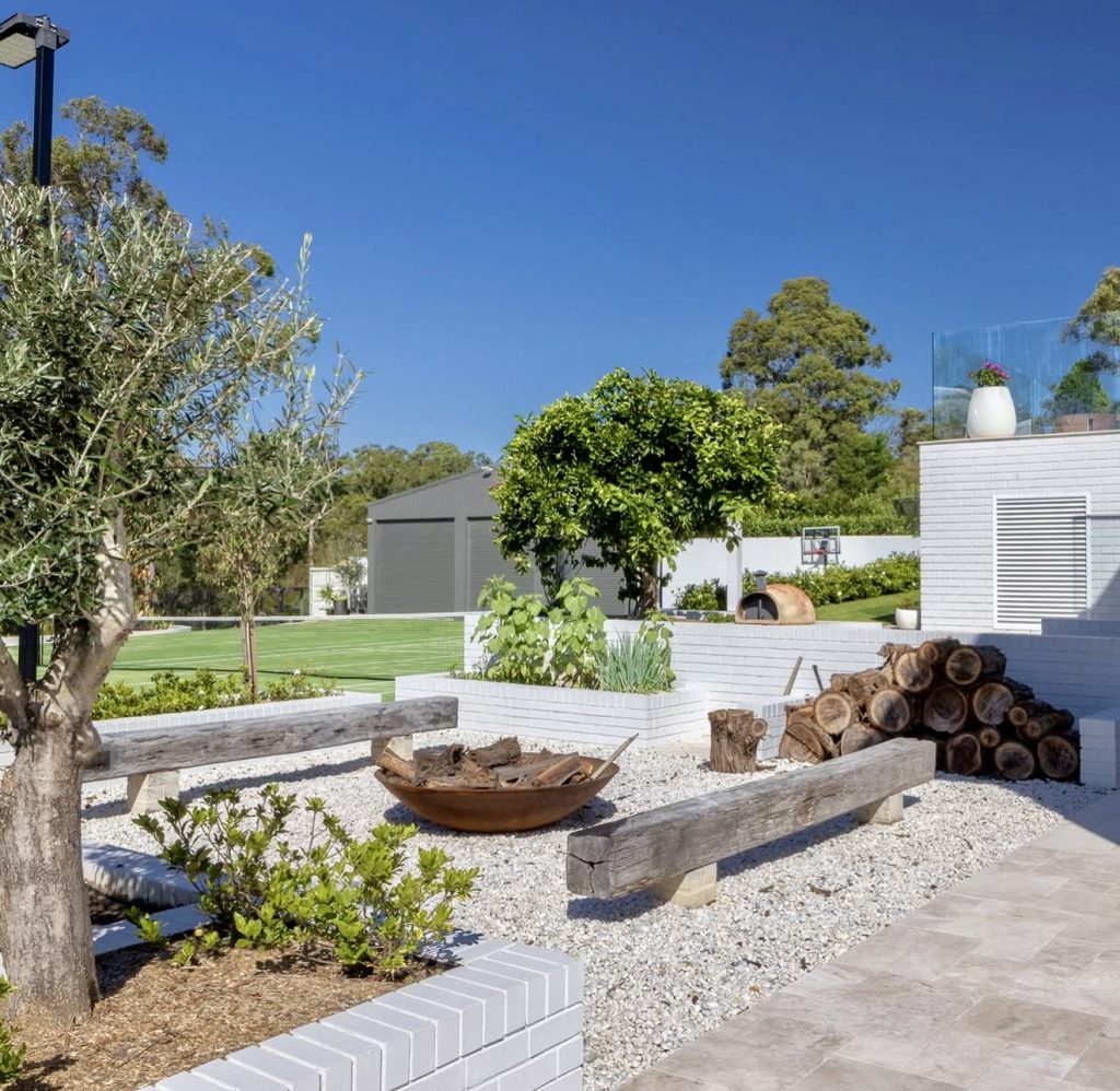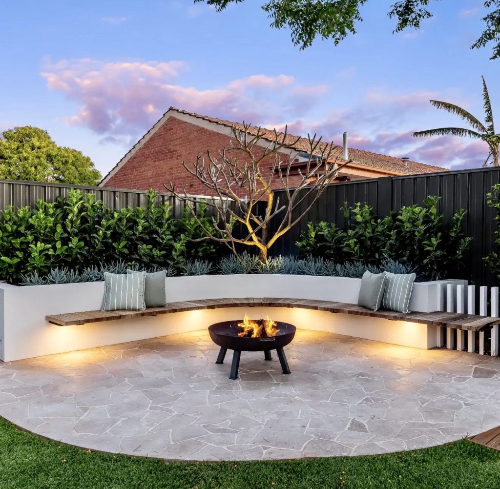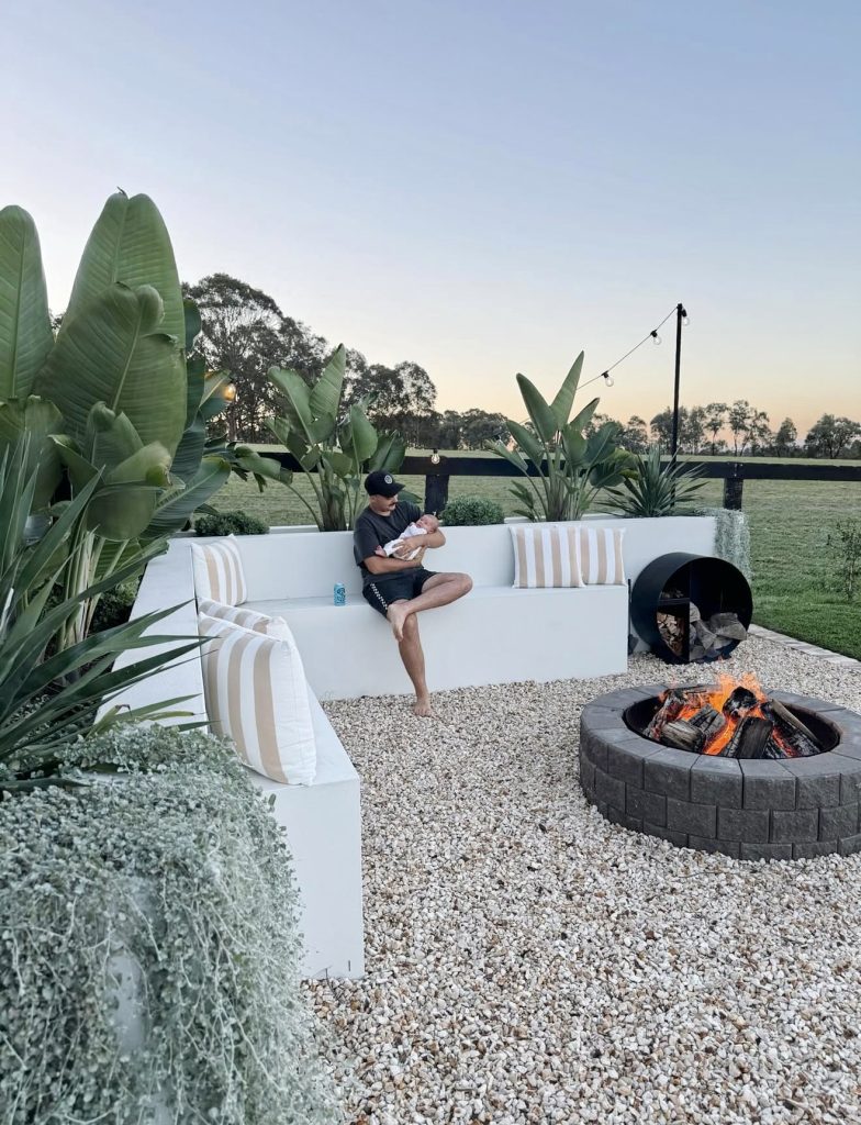 Built-in white seating paired with striped cushions gives this space a relaxed California feel while keeping the layout incredibly simple. The pebble flooring is a smart DIY-friendly choice, and the oversized tropical plants soften the crisp lines of the bench, making the area feel private and serene. The circular stone fire pit keeps the look grounded, and because the design doesn’t rely on formal pavers or decking, it’s a great idea for anyone working on a budget but wanting a polished, magazine-ready finish.
