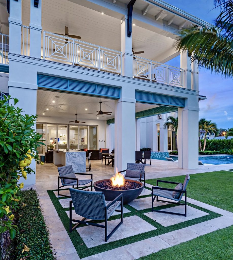 This elevated design blends modern minimalism with resort-level comfort. A sculptural gas fire bowl sits at the center of a geometric grid made of large pavers separated by artificial turf, creating a striking contrast that feels both architectural and inviting. Lightweight woven seating keeps the space airy, making it perfect for a backyard adjacent to a pool and entertaining area. This type of setup proves that clean lines and smart material choices can deliver a high-end look without overcomplicating the layout.