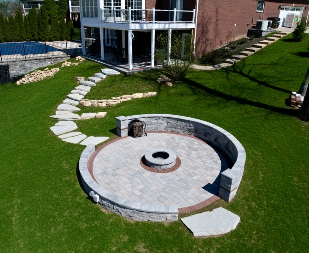 This impressive sunken fire pit terrace shows how hardscaping can turn a sloped yard into a destination. The circular stone seating wall creates a protected nook, while the smooth brick pavers ground the design in symmetry and comfort. A curved walkway leads guests down through the lawn, blending naturally with the surrounding landscapes and giving the whole area a crafted, intentional feel. Despite its grandeur, the concept itself is surprisingly adaptable—even a smaller in-ground version can bring this sense of coziness to an average suburban backyard.