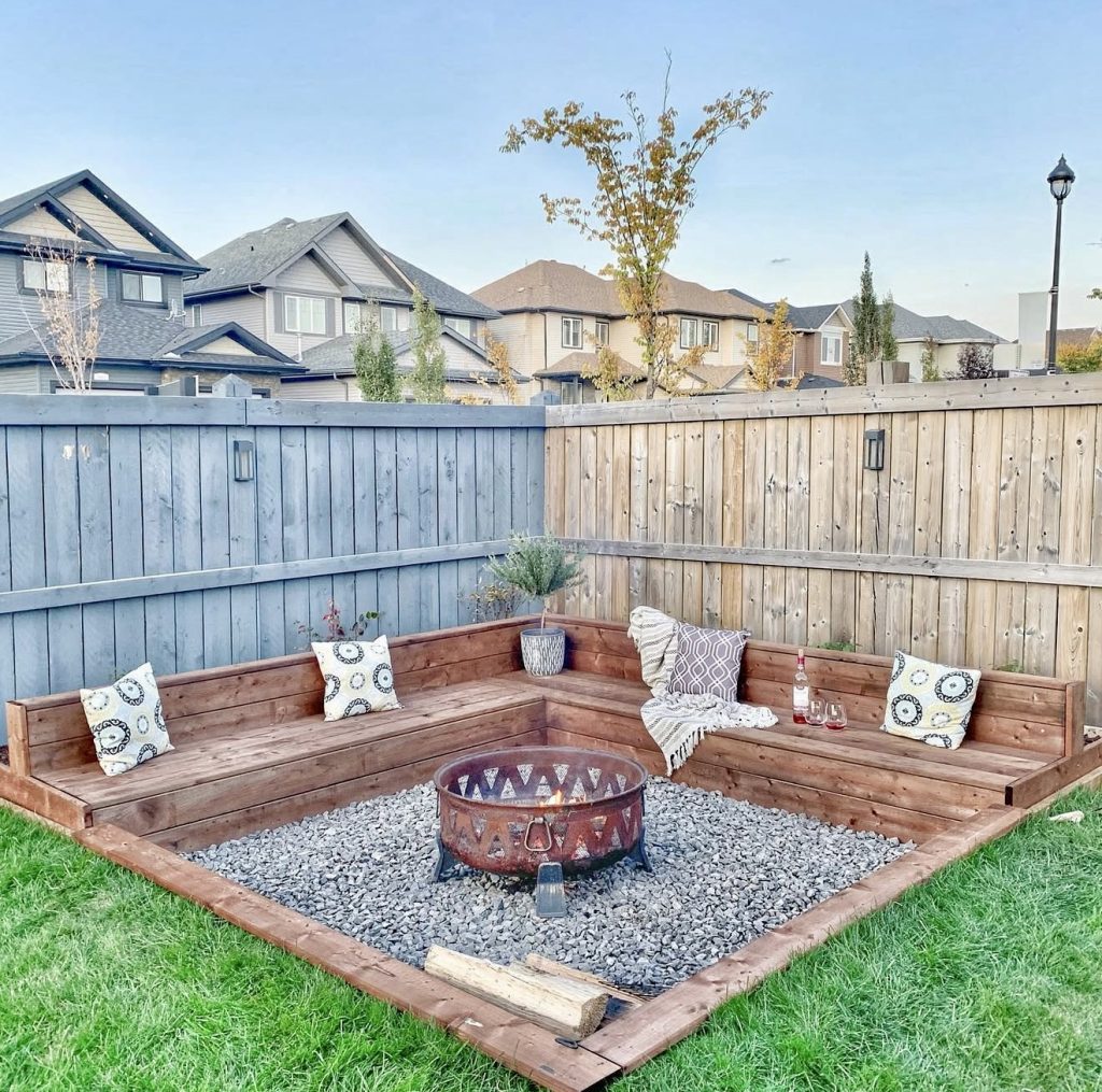 In this image, the homeowner takes DIY to a whole other level in terms of how it can help transform the backyard corner area into an attractive fire pit seating space. With the wooden benches beautifully constructed around the space, any regular suburban house can easily transform into an appealing outdoor relaxation space where people can retreat and unwind. In addition, any homeowner can easily transform the floor using gravel. It is cost-effective and does not need much construction. The steel bowl pit gives the space such rustic and attractive flair, while the colorful cushions make the benches feel like an extension of the house itself. It is definitely an idea any homeowner can easily work with, especially when working with any budget at all.