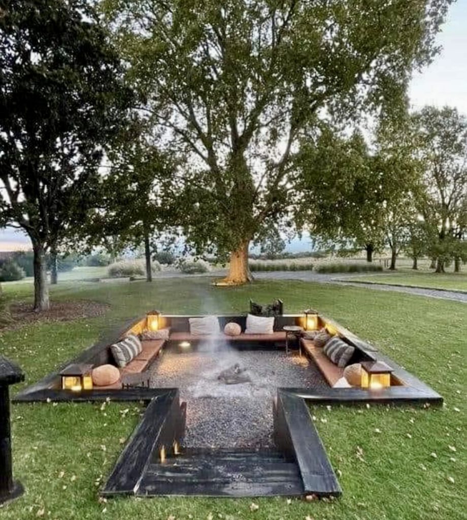 This sunken fire pit is the kind of idea you save to your “dream house” Pinterest board. Set into the landscape, it creates a natural sense of privacy while still feeling open to nature. The built-in seating and layered lighting take the design to the next level, turning it into the perfect place for long evening conversations. The gravel surface keeps it simple, and recessed steps make the entrance feel intentional and architectural. Home design experts often say that lowering the seating area creates instant intimacy—and this space is proof. A fully in-ground layout like this elevates any backyard and pairs beautifully with larger landscapes.